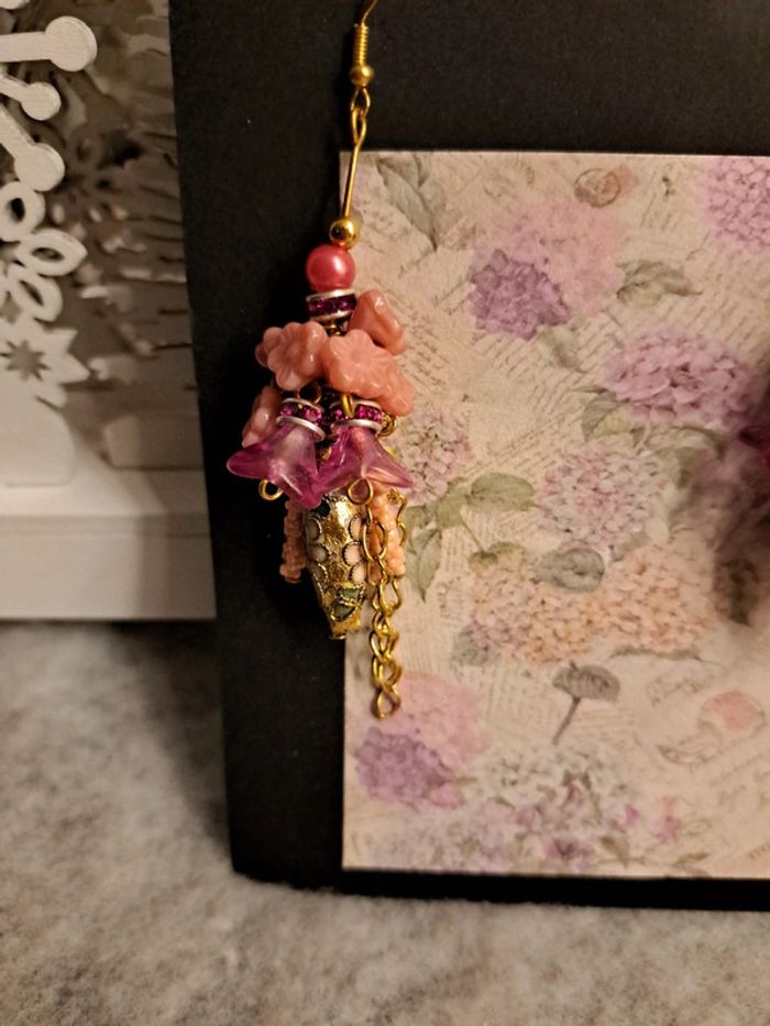 Magnifique boucles d'oreilles pendante avec perles rose fleur acrylique rose violette et Magnifique perles cloisonné doré rose Style bohème champêtre