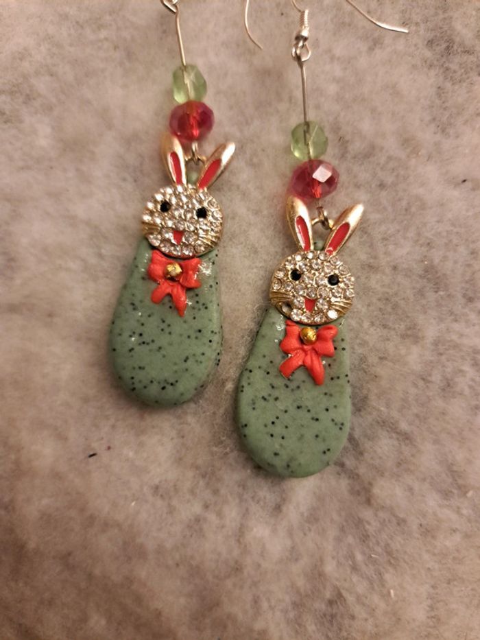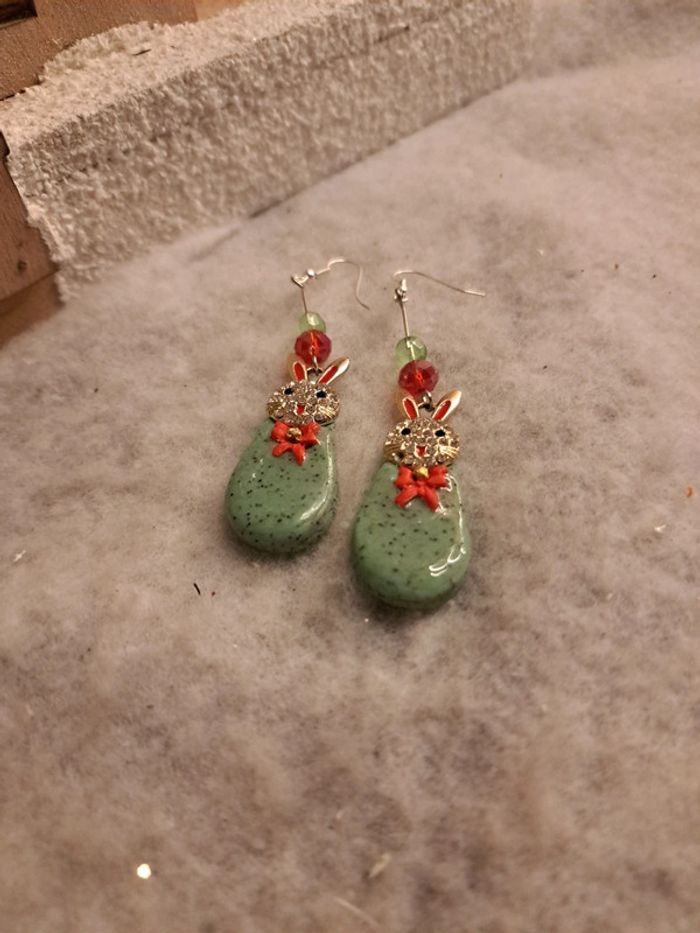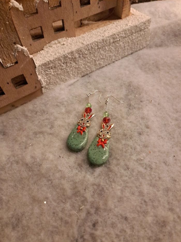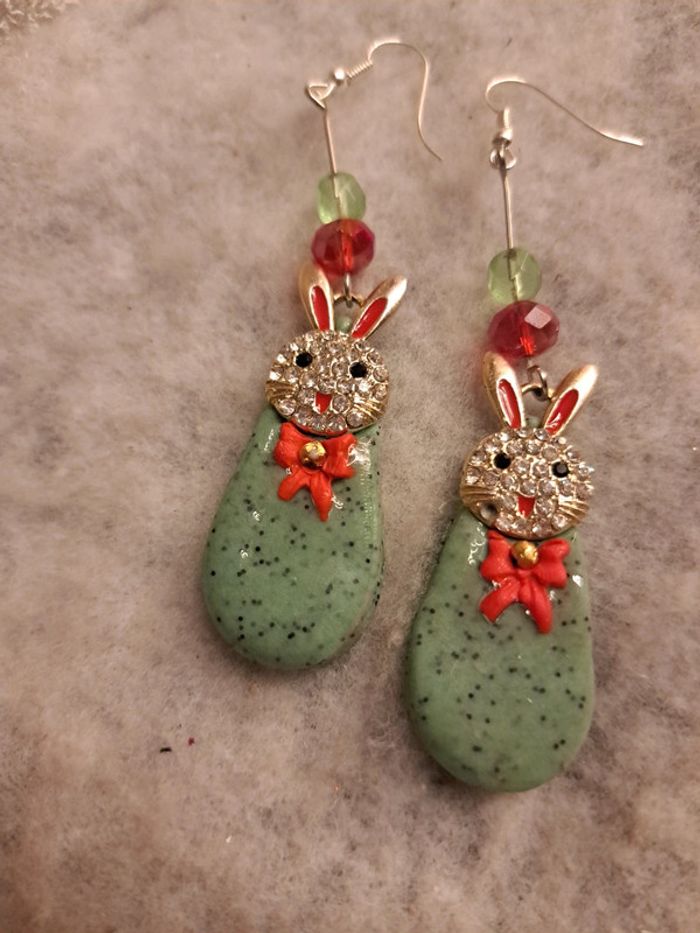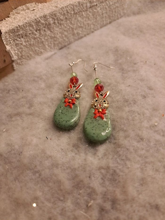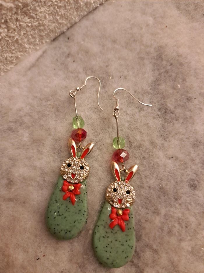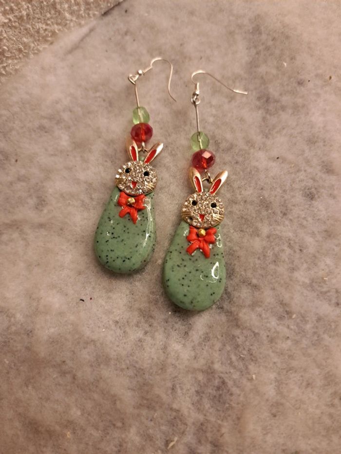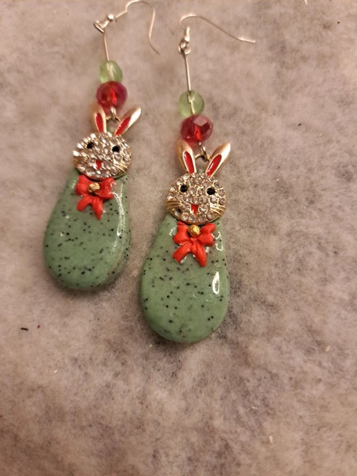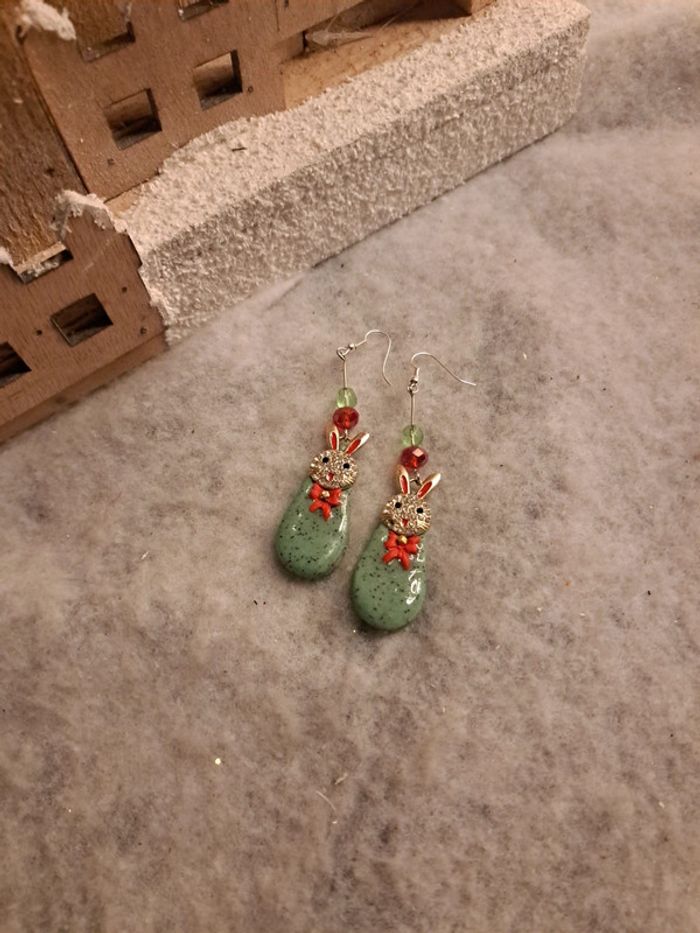 Boucles d'oreilles pendante avec pâte polymere verte granité petit nœud rouge breloques petit lapin 🐰 strass forme gouttes couche résine Couleur de Noël 🎄 🤶