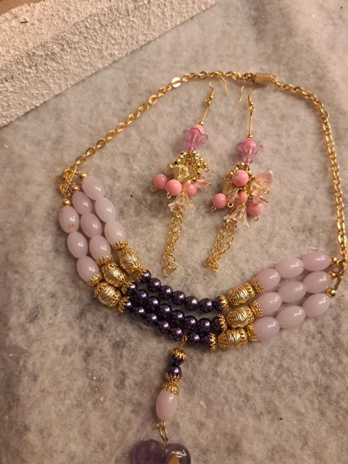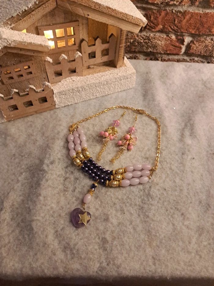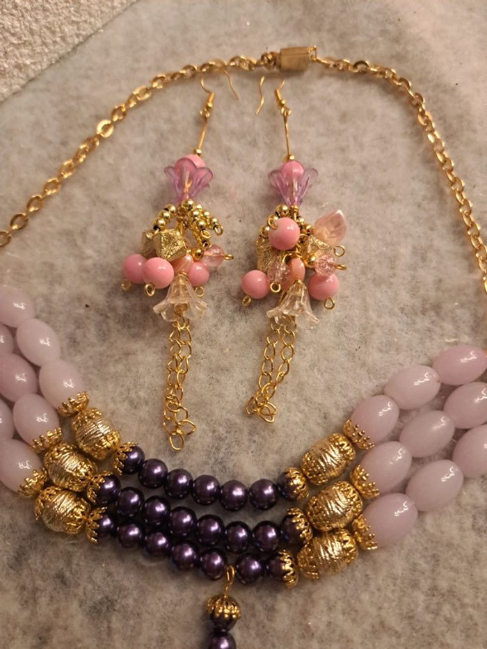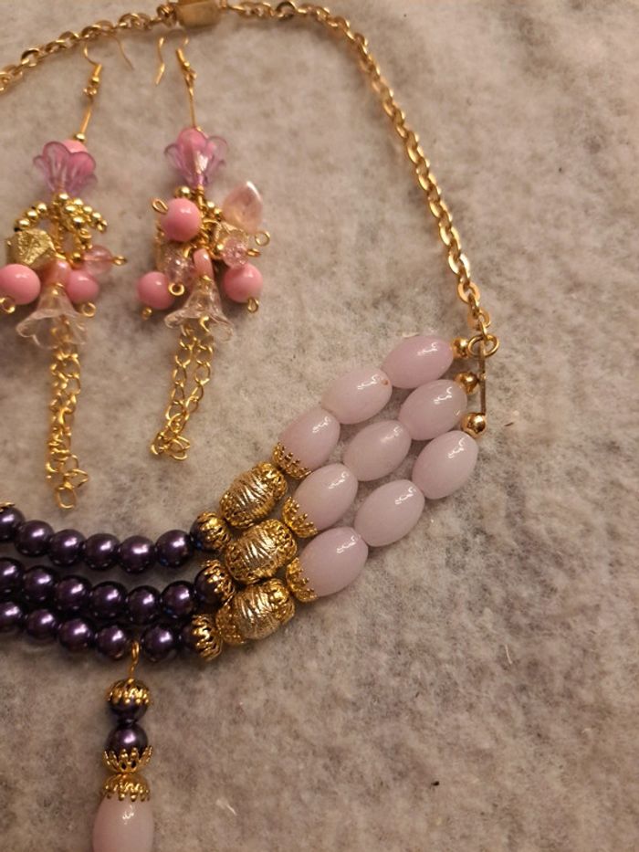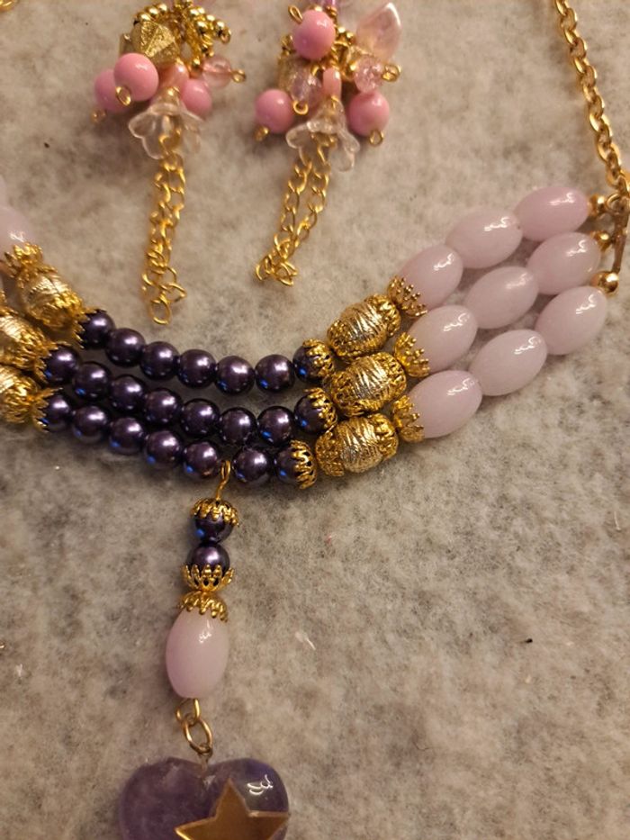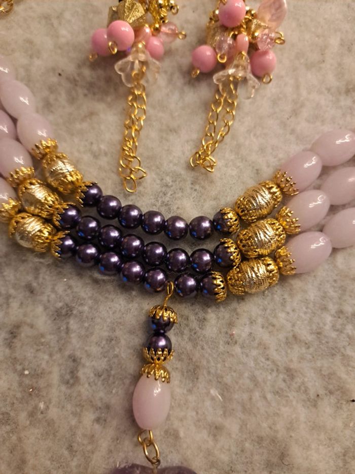 Magnifique ensemble composée d'un collier multi rang violet doré avec pendentif pierre semi précieuses et boucles d'oreilles pendante avec perles rose doré et petites fleurs acrylique rose Ensemble superbe