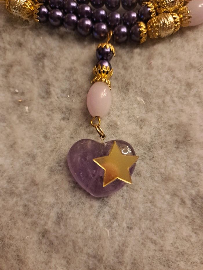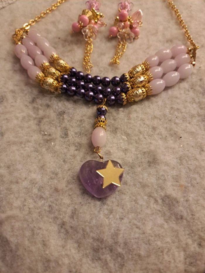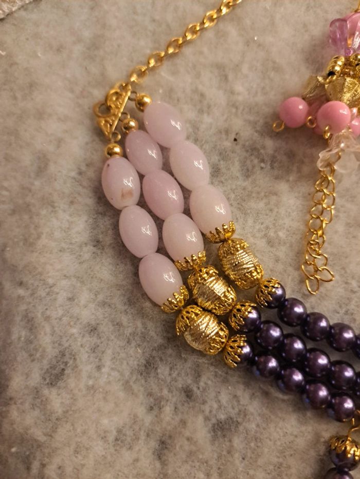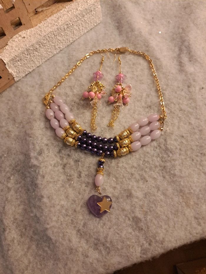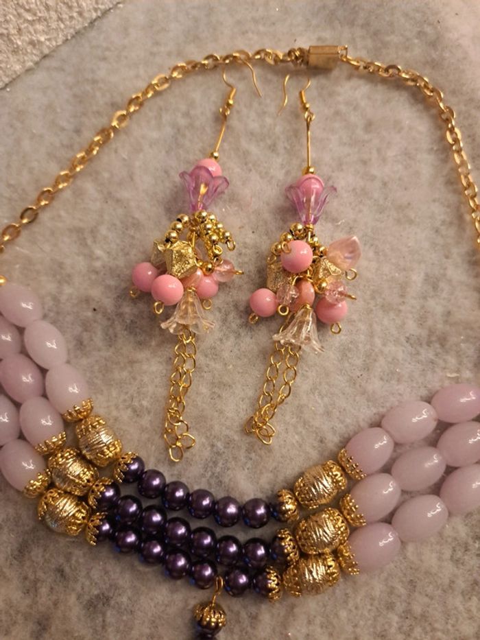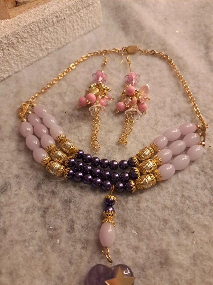 Magnifique ensemble composée d'un collier multi rang violet doré avec pendentif pierre semi précieuses et boucles d'oreilles pendante avec perles rose doré et petites fleurs acrylique rose Ensemble superbe