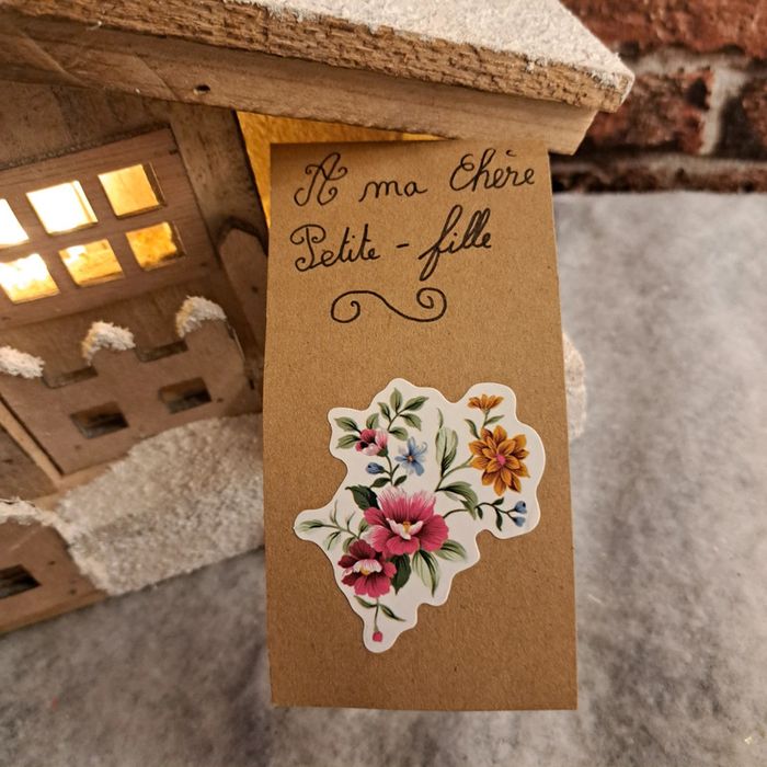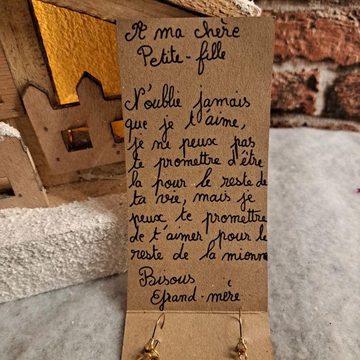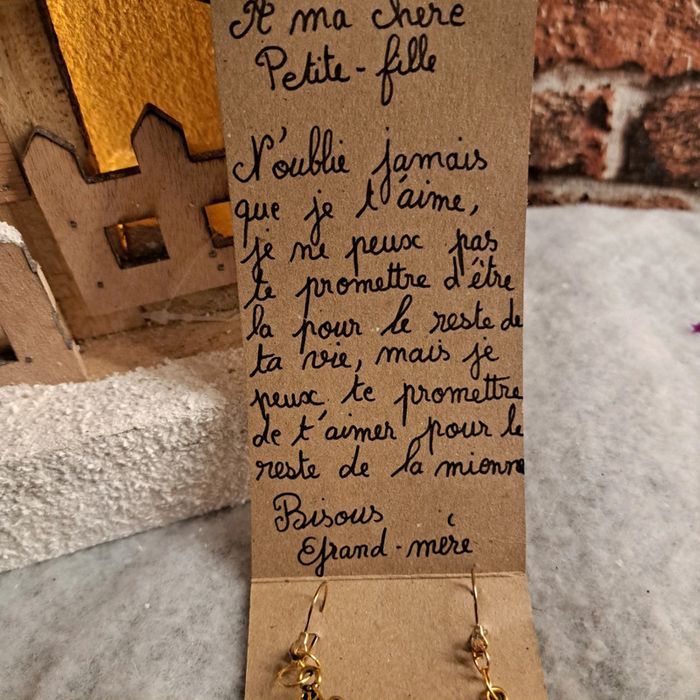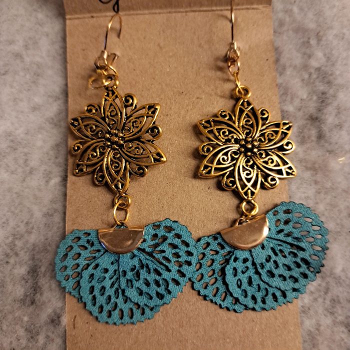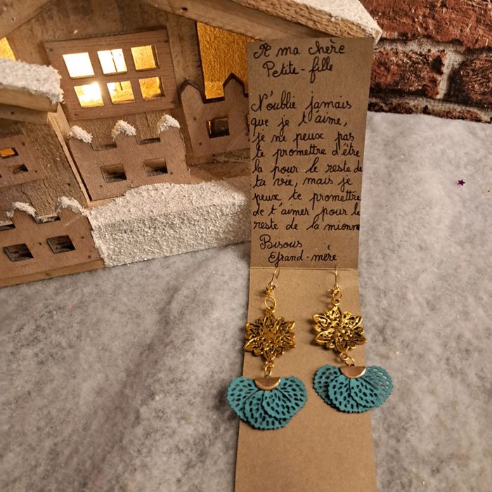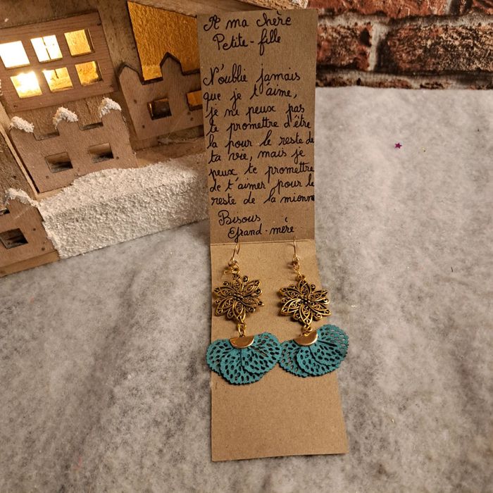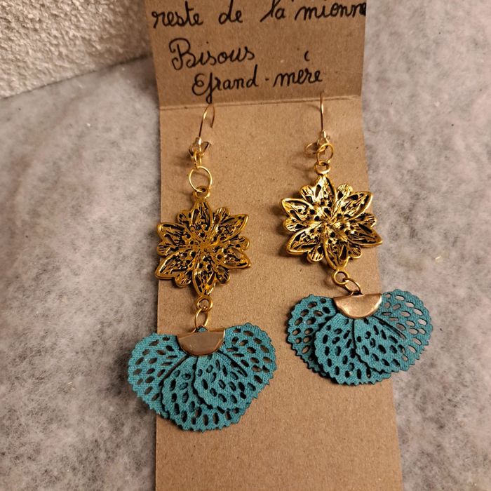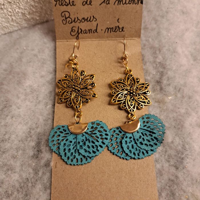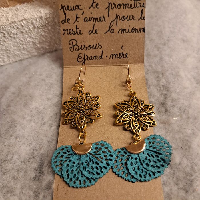 Boucles d'oreilles pendante avec estampes fleur doré et pendentif bleu tissu ajourée Le tout accompagné d'un gentil petit mot