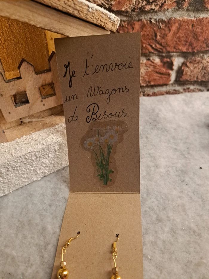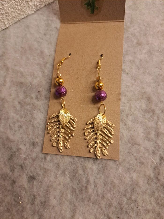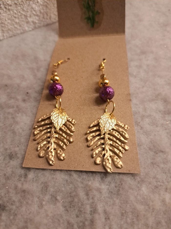 Boucles d'oreilles pendante avec perles violette doré et une magnifique feuille doré Champêtre bohème Accompagné d'un gentille petit mot