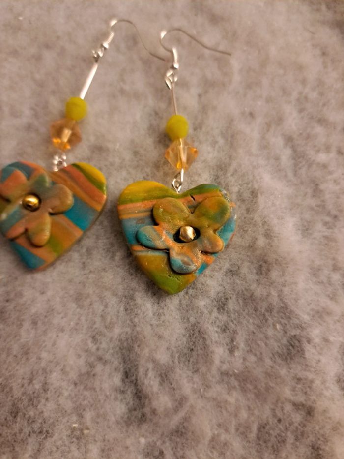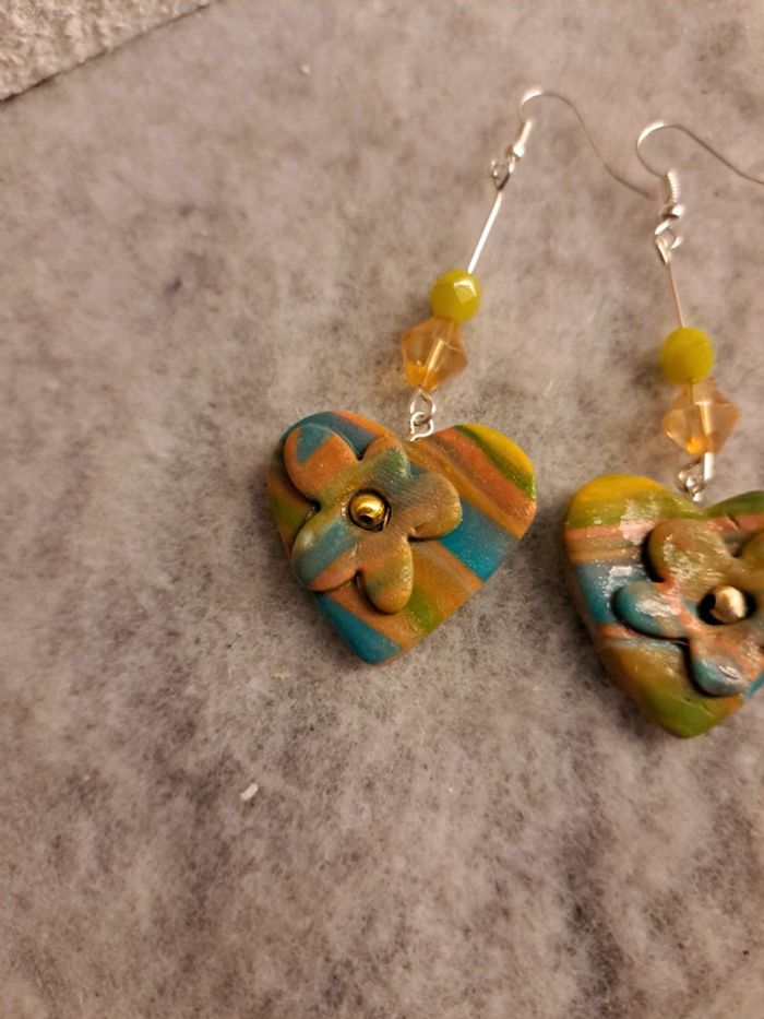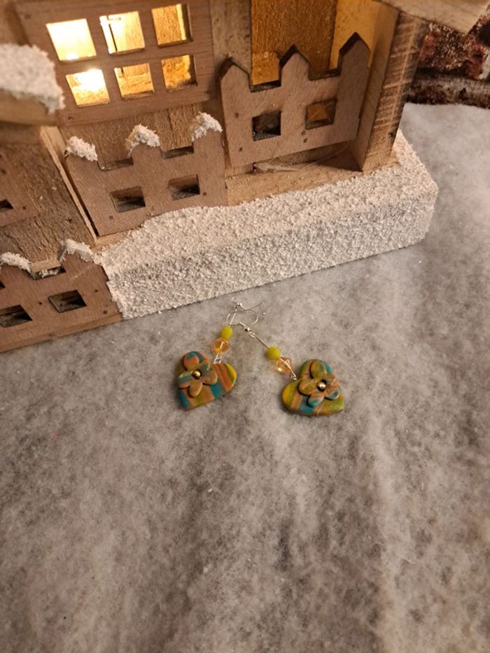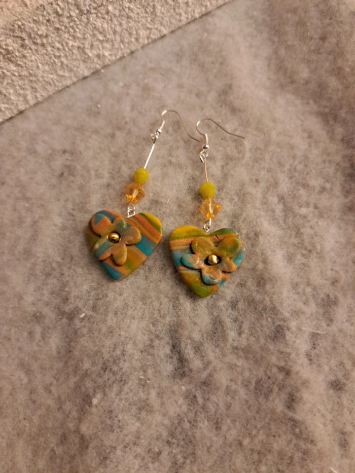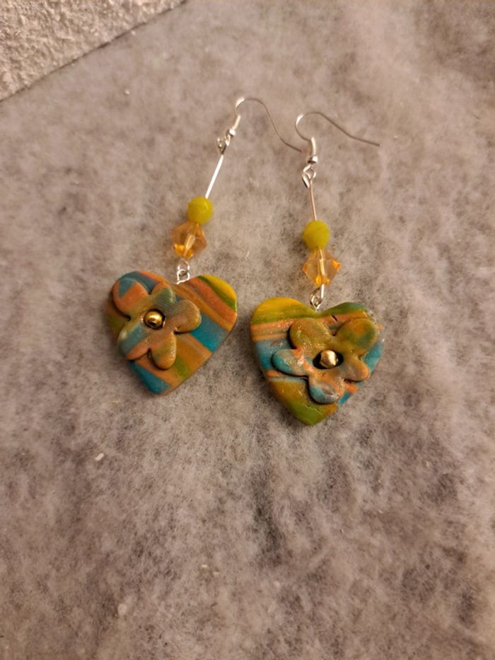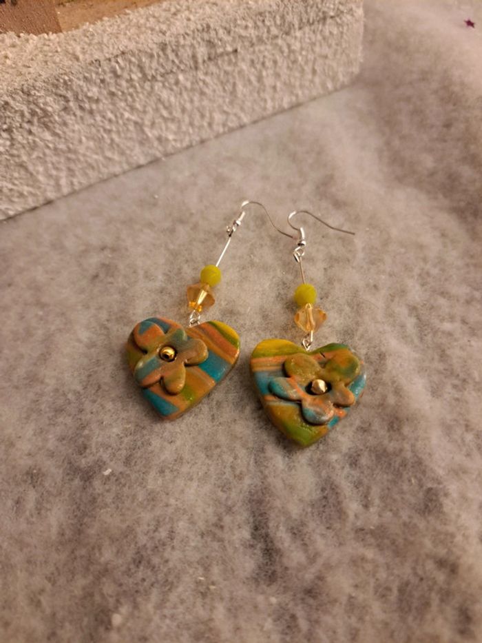 Boucles d'oreilles pendante avec pâte polymere cœur multicolore