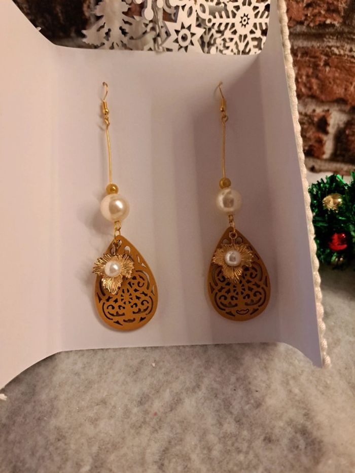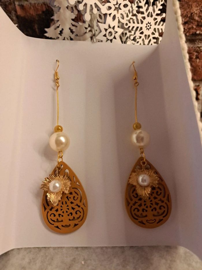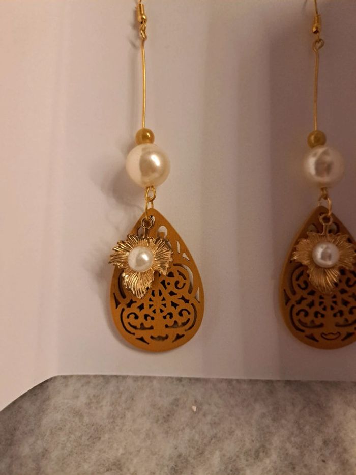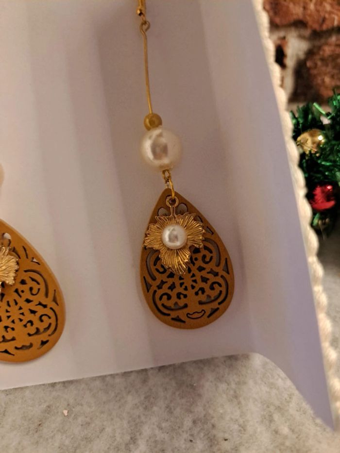 Jolie boucles d'oreilles pendante avec estampes bois marron safran avec breloques feuilles doré petite perles blanches nacré Magnifique