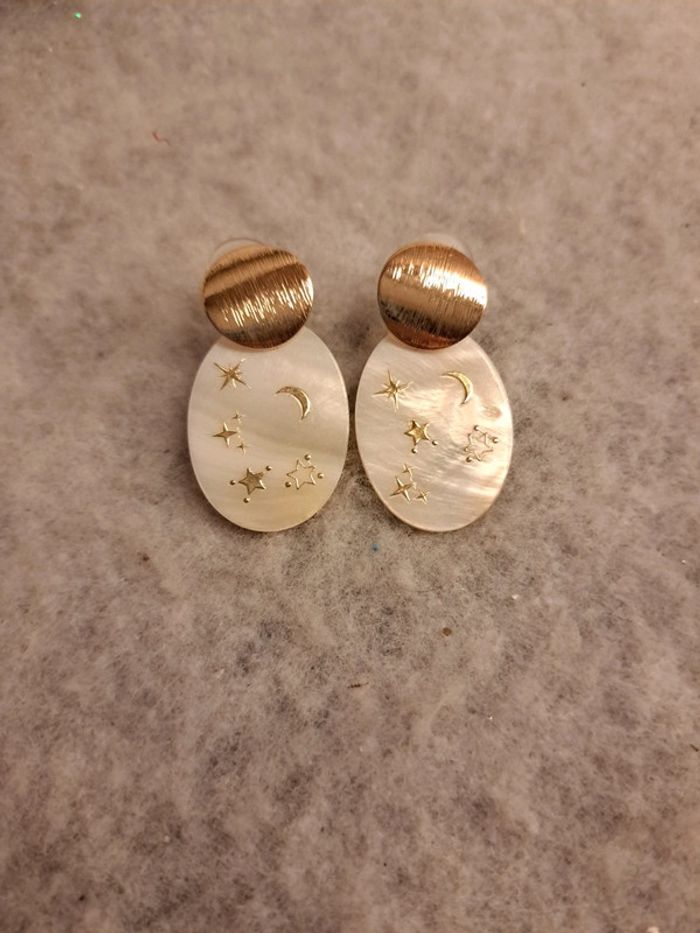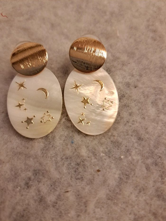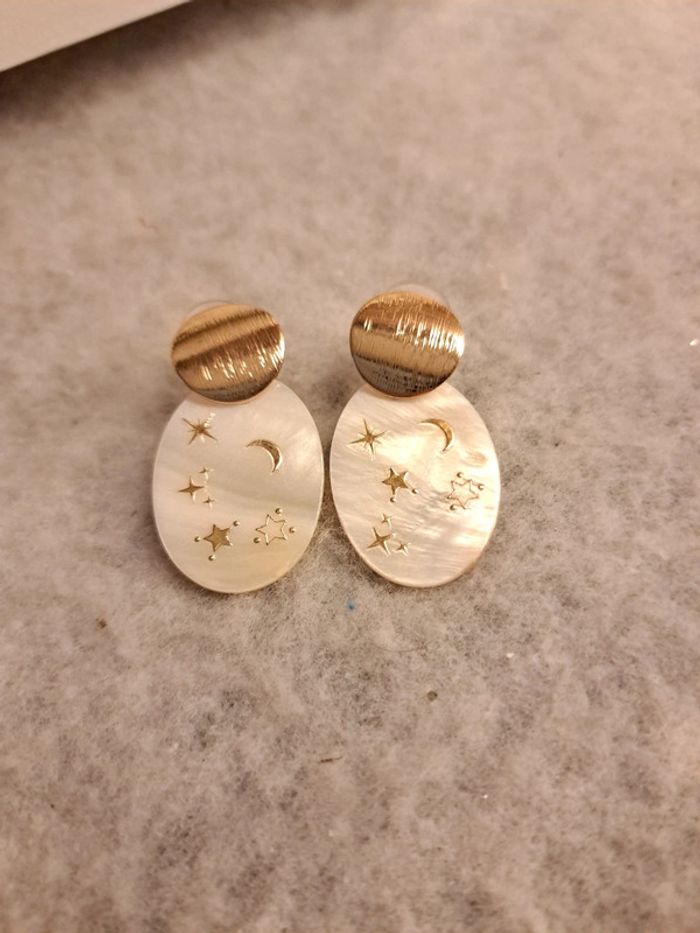 Jolie paire de boucles d'oreilles pendante en nacre avec stickers étoile 🌟 crème blanc doré Magnifique