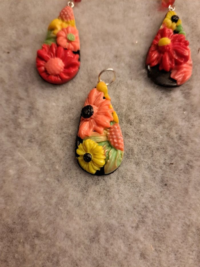 Parrurre boucles d'oreilles et pendentif florale pâte polymere multicolore - photo numéro 1
