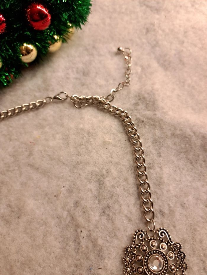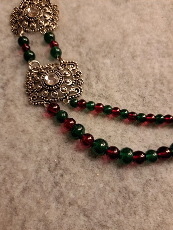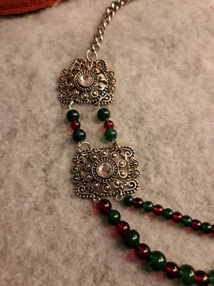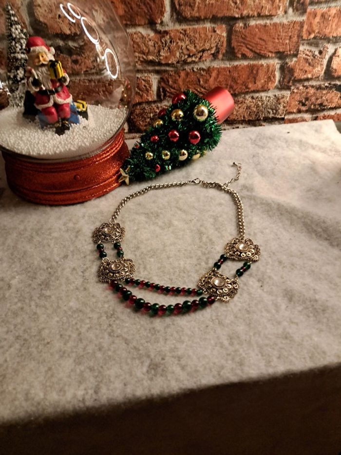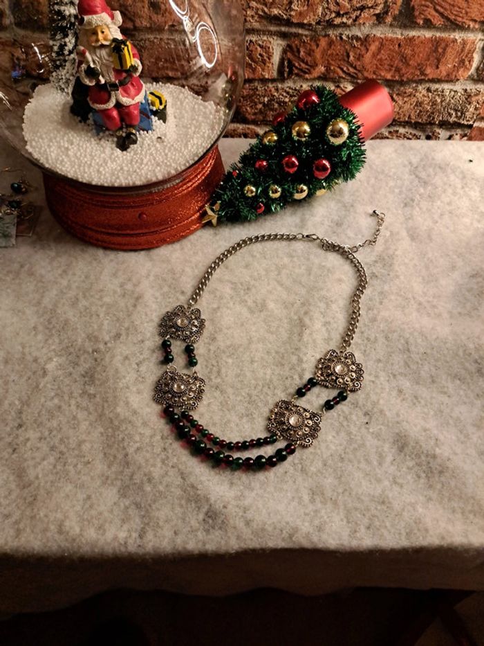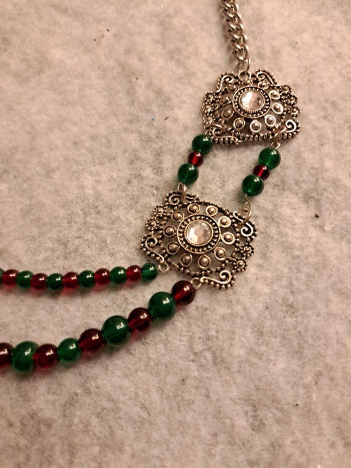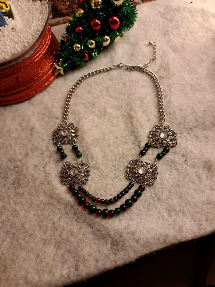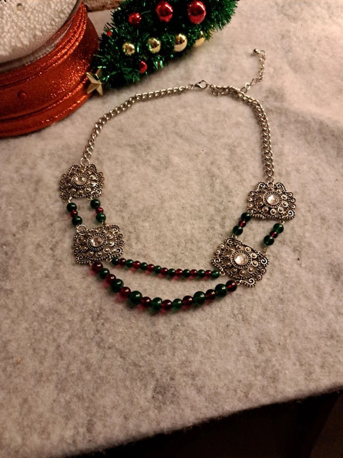 Jolie collier chaîne argenté acier inoxydable avec Strass blanc sur les estampes perles en verre verte et rouge Magnifique