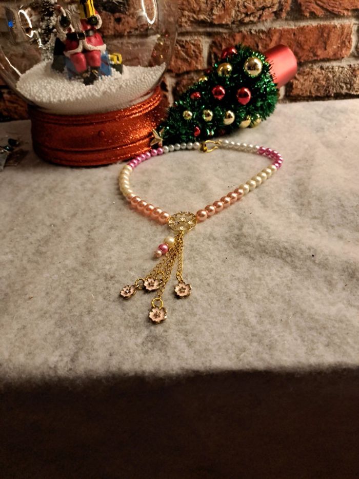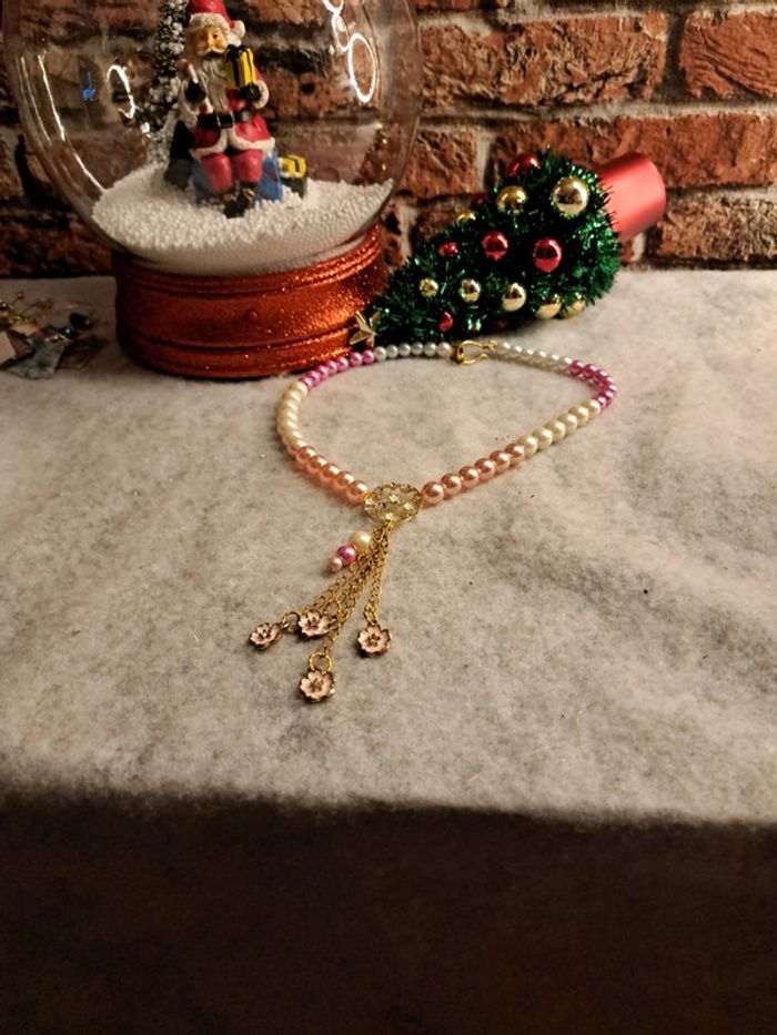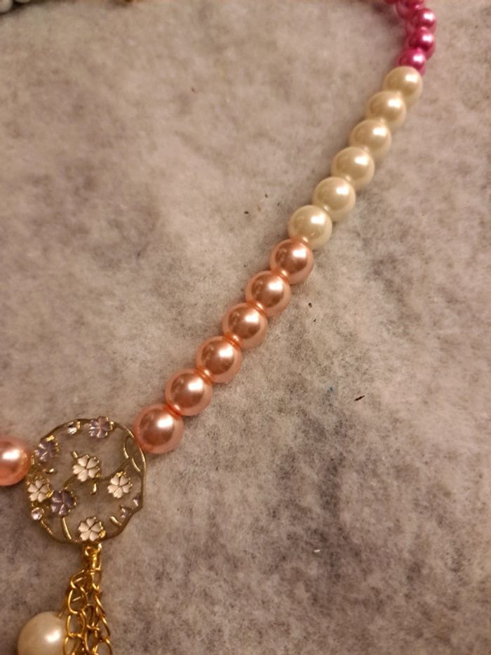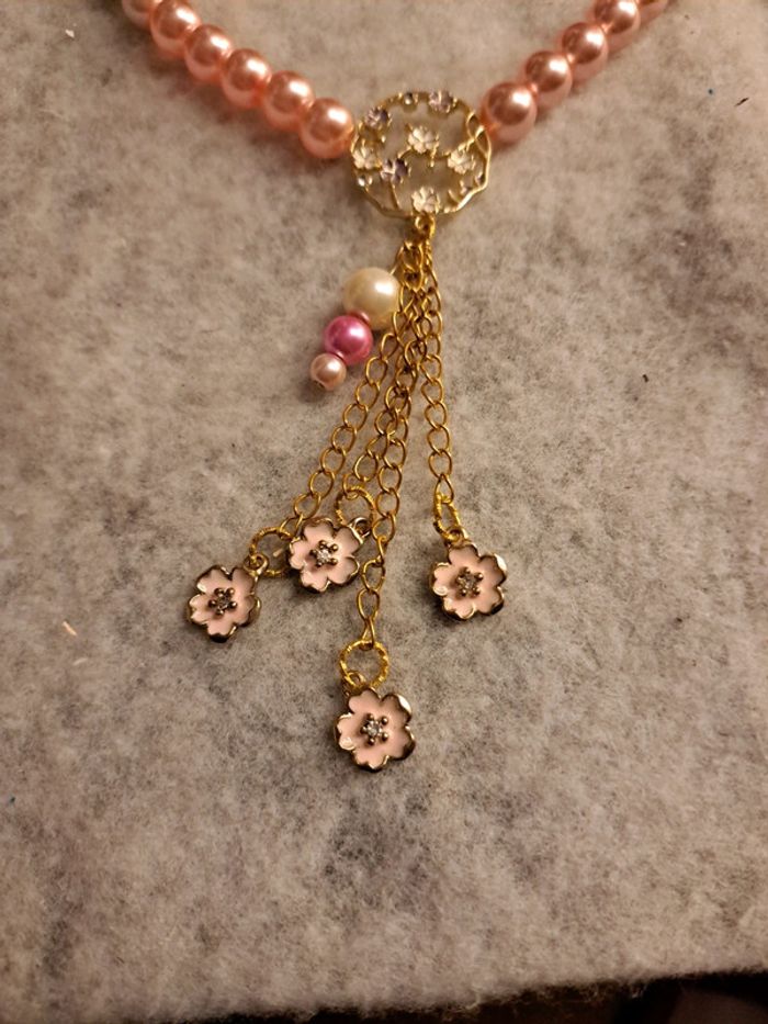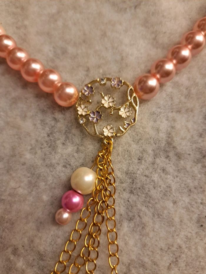 Magnifique collier avec perles rondes nacrées rose pastel rose fushia et blanc avec cascade de petite chaînette doré et petites fleurs rose Splendide artisanale