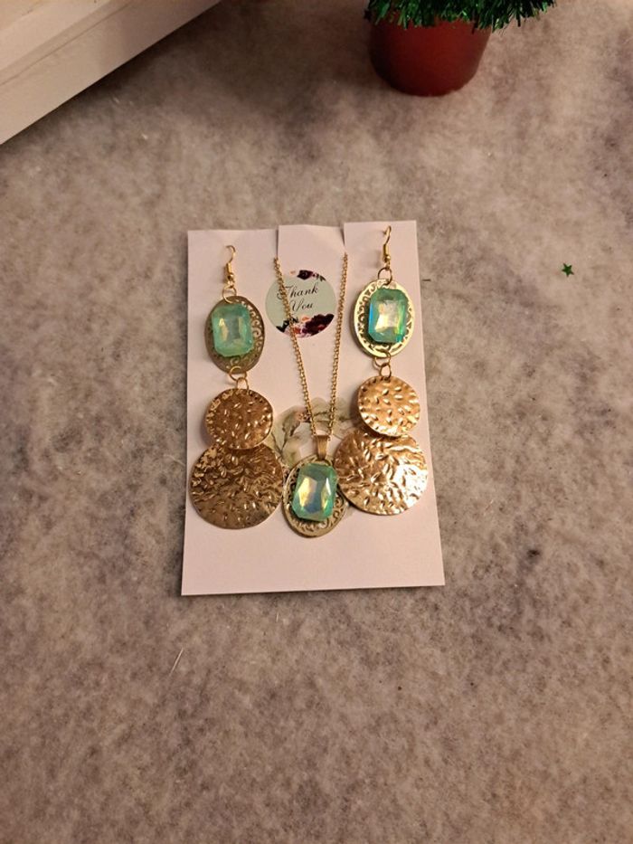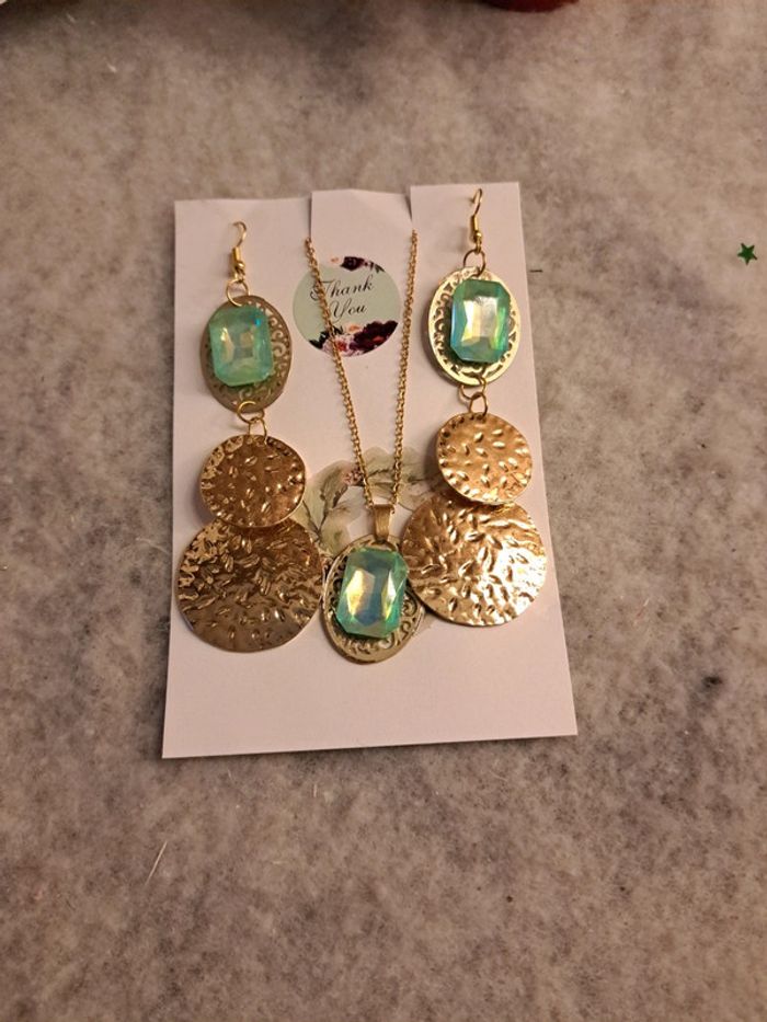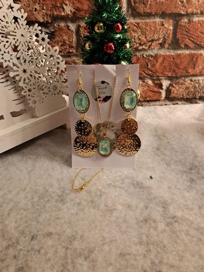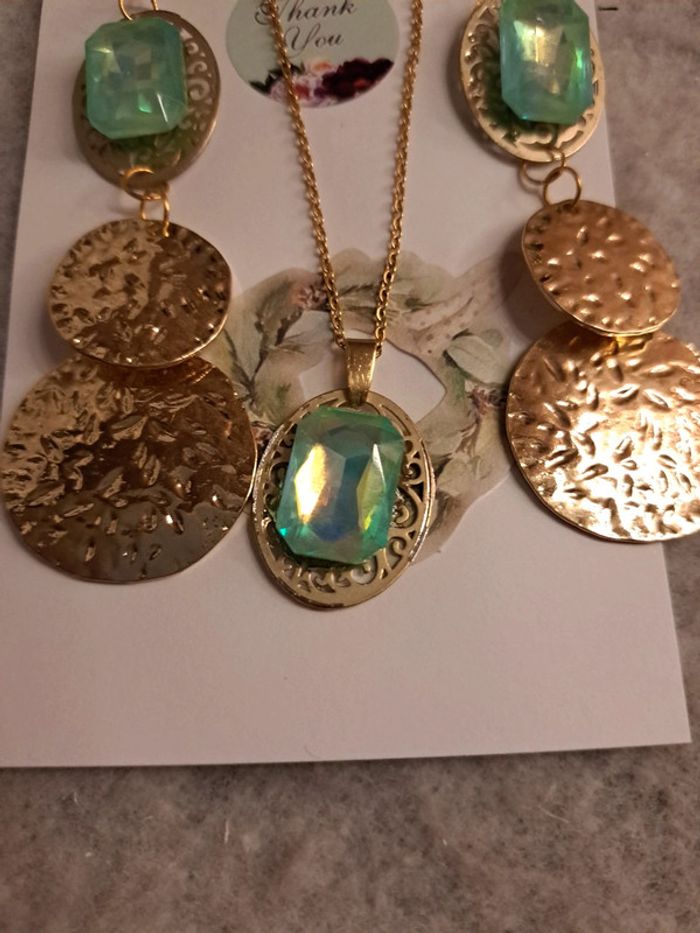 Boucles d'oreilles pendante avec collier assortie strass vert bleu - photo numéro 1
