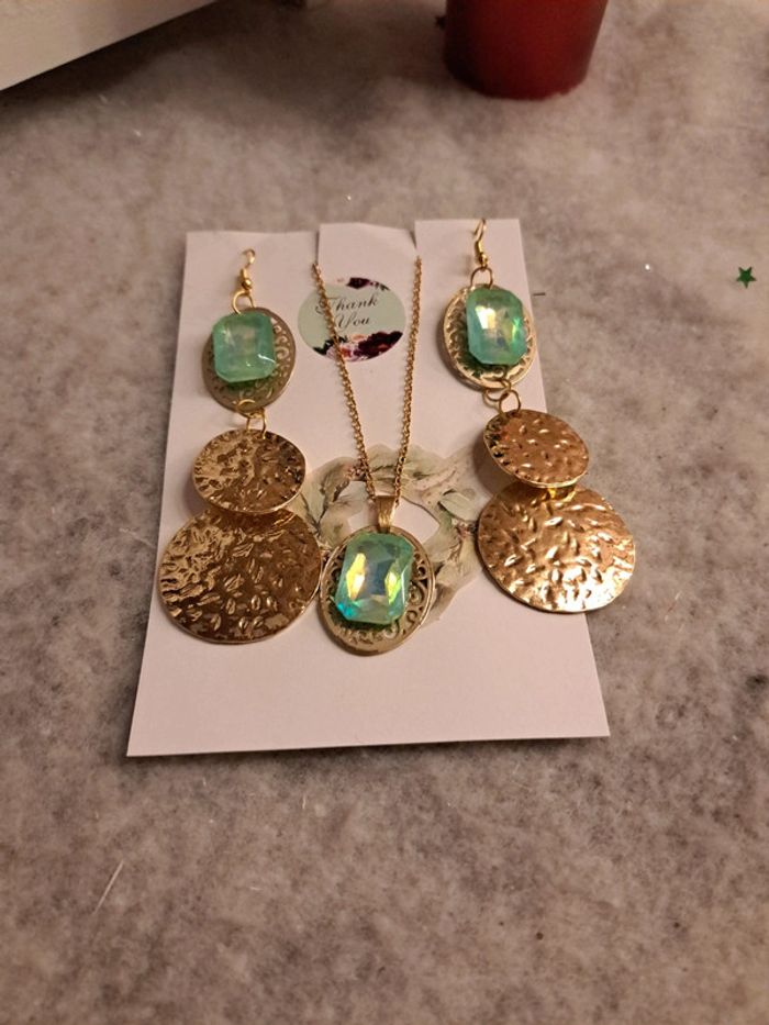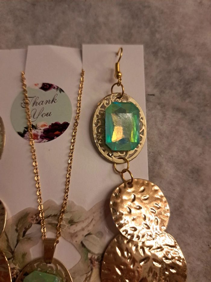 Boucles d'oreilles pendante avec collier assortie strass vert bleu - photo numéro 10