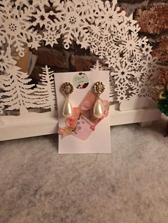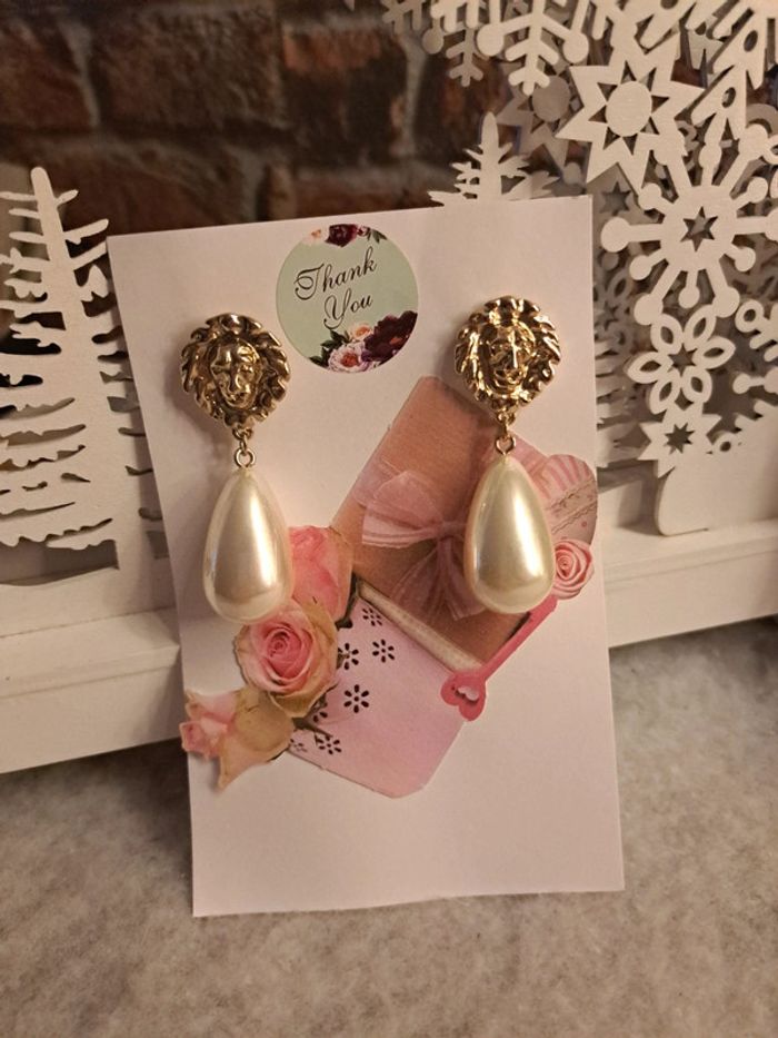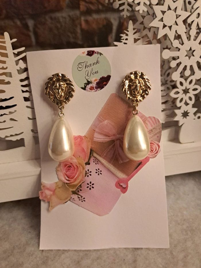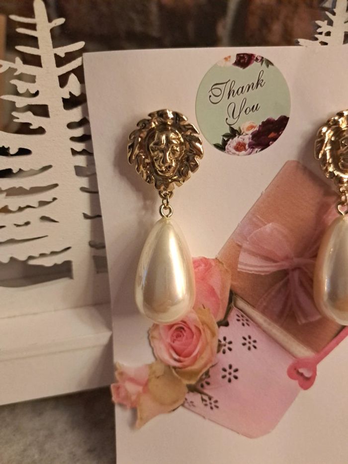 Jolie paire de boucles d'oreilles pendante avec lion doré puis goutellettes nacré blanche Magnifique chic et élégant