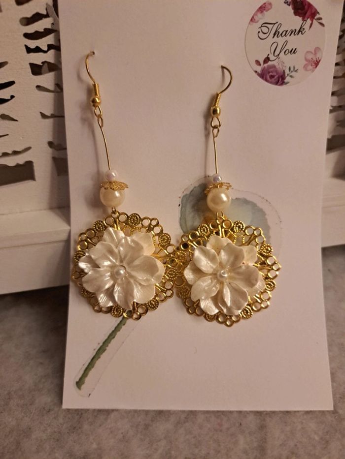 Jolie paire de boucles d'oreilles pendante avec estampes fleur doré avec fleur acrylique blanche Magnifique