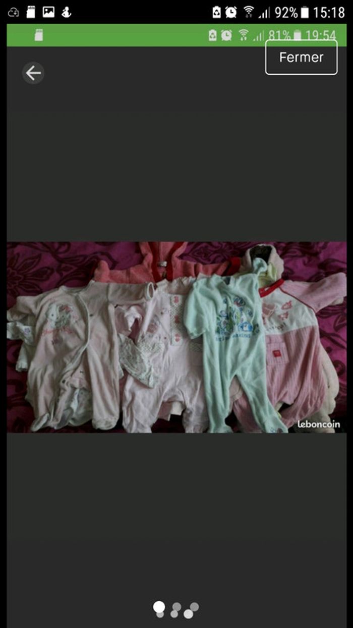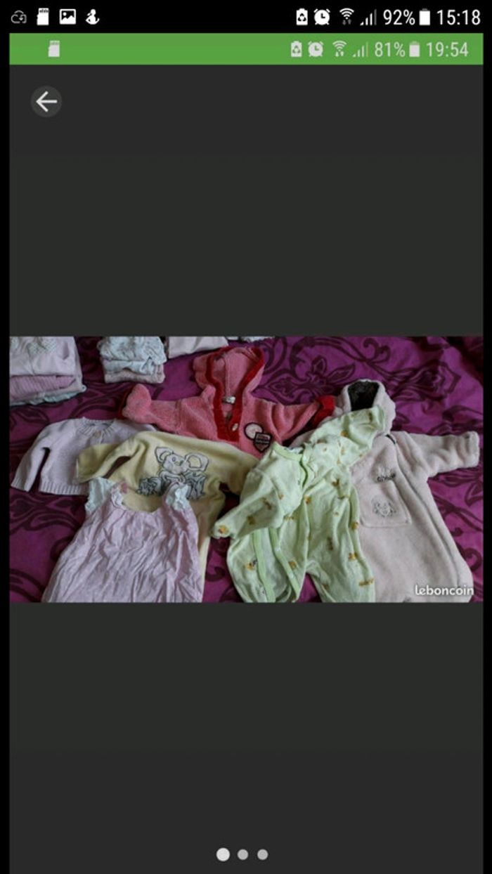 Bonjour Je vend ce lot de vêtements taille 3 mois fille 6 pantalons 1 sous pull 2 salopette 2 robes 1 ensemble pantalon pull ( pull tacher) 1 débardeur 6 pyjamas 14 body manche longue 5 body manche courte 4 gilets 2 combi short 2 pull 1 manteau 46 articles 30€. Je vend aussi un lot de vêtements taille 6 mois fille.