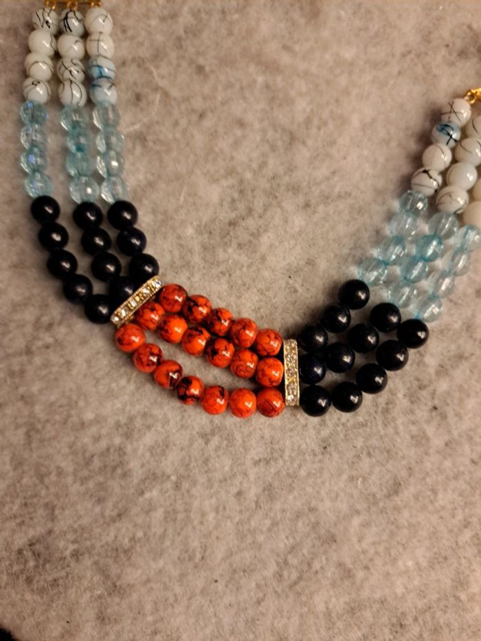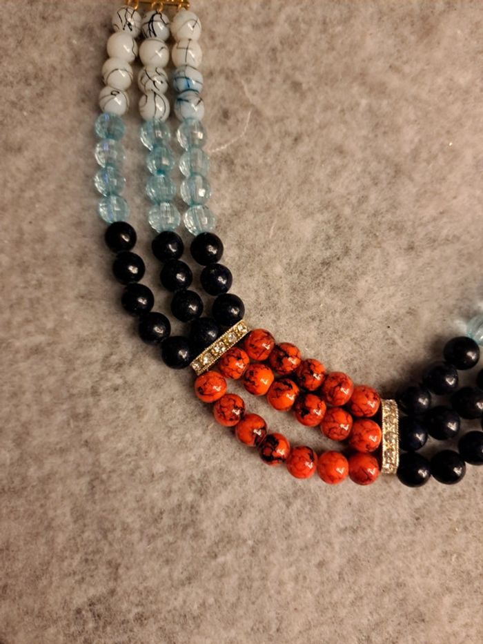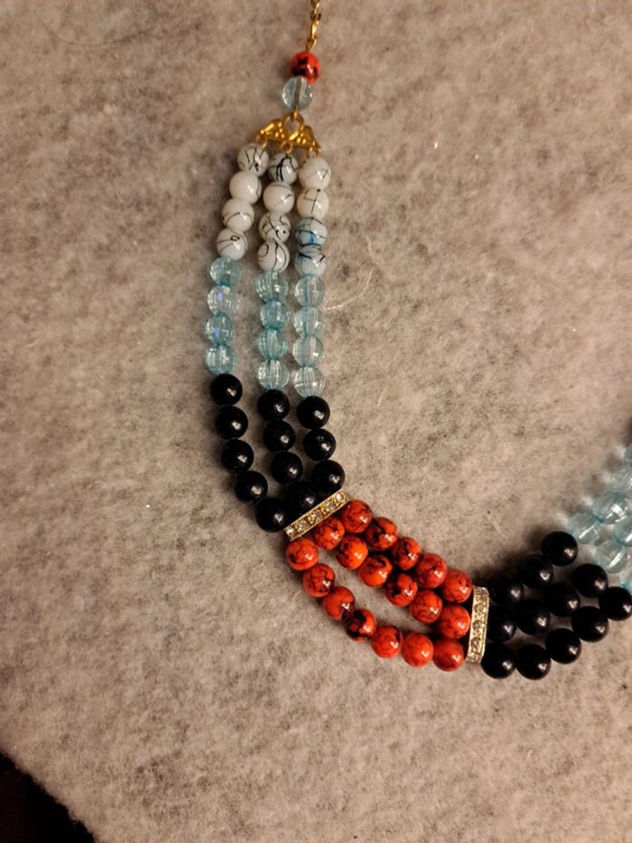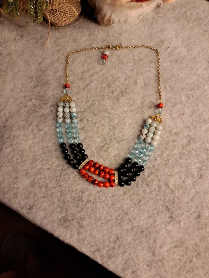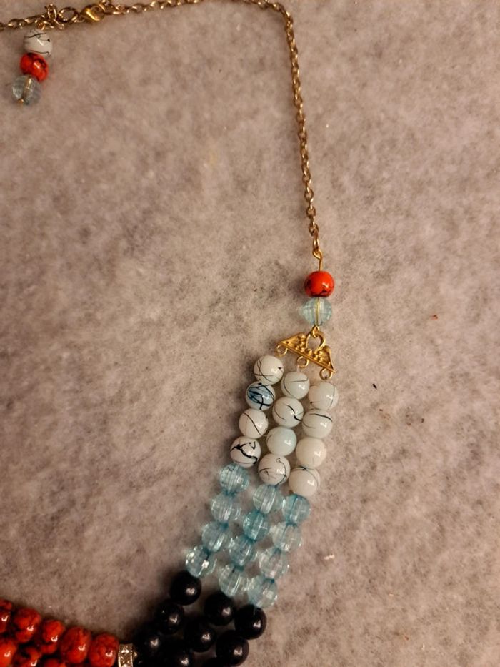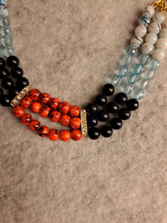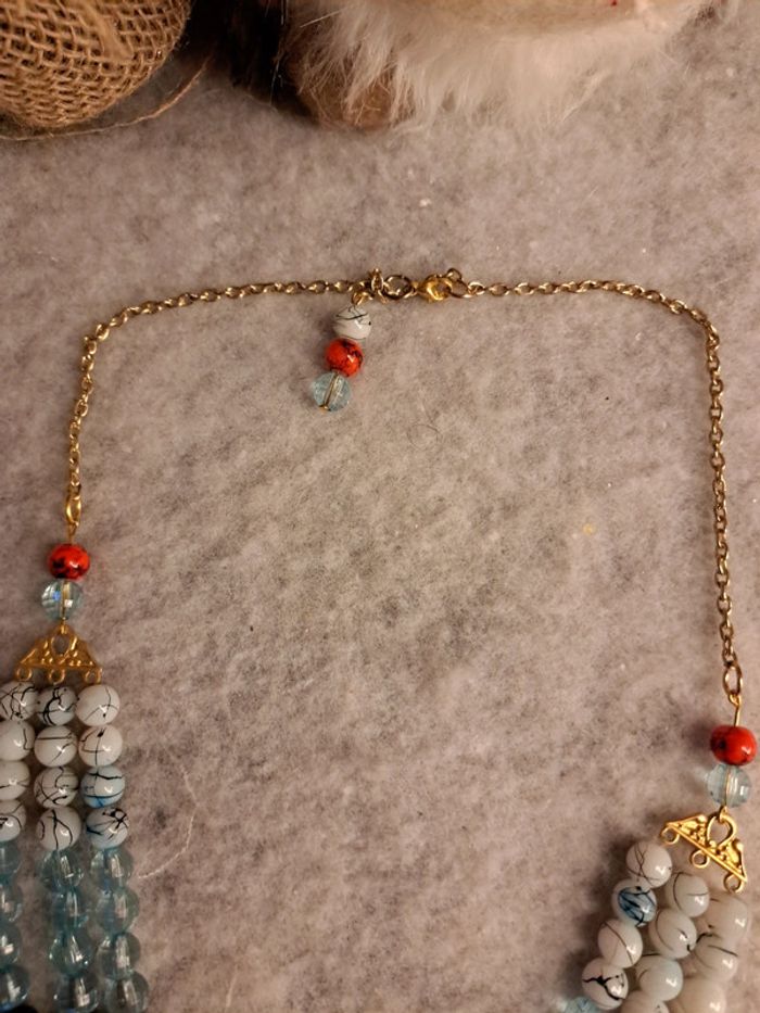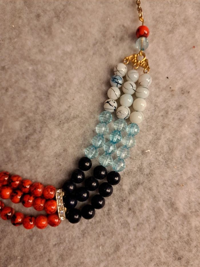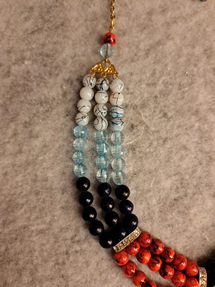 Collier multi rang chic et élégant couleur rouge bleu blanc doré avec barrettes de strass blanc Magnifique