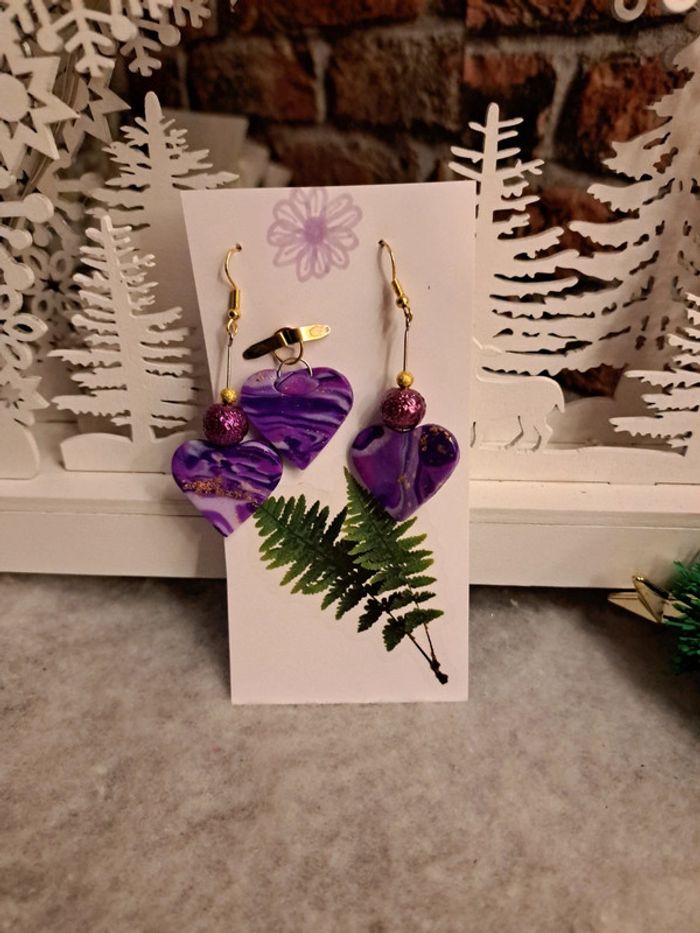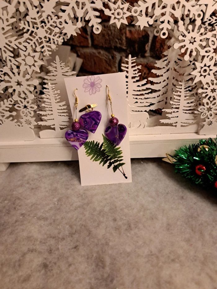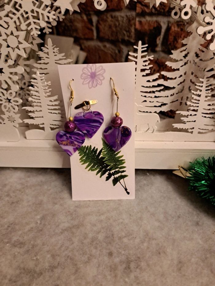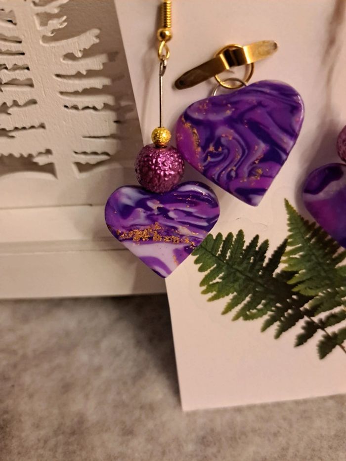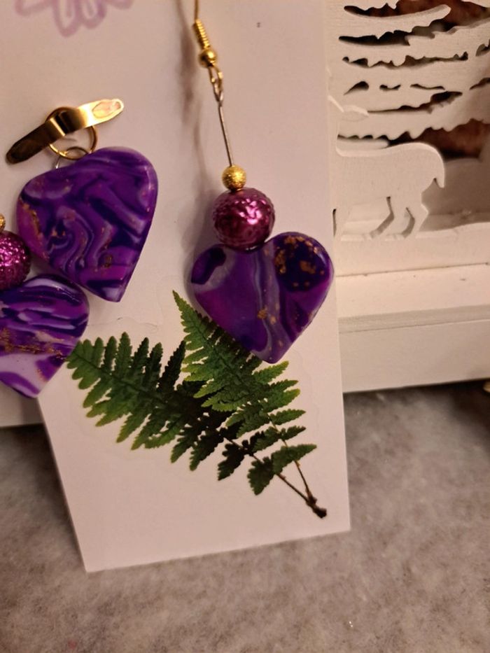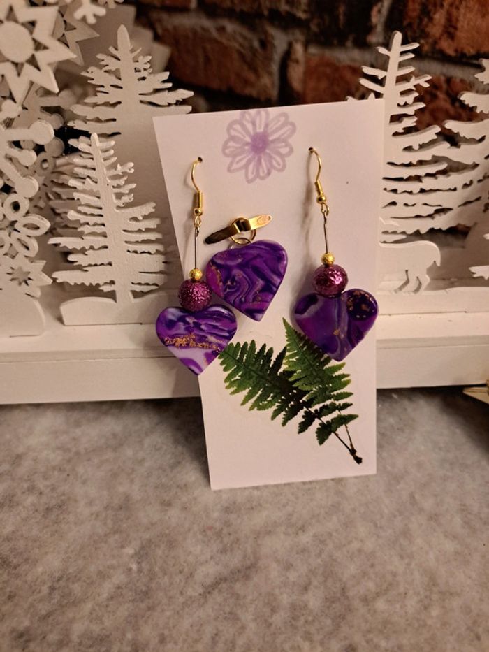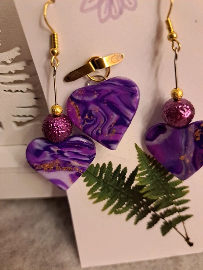 Boucles d'oreilles pendante forme cœur pâte polymere violette avec pendentif assortie Bohème