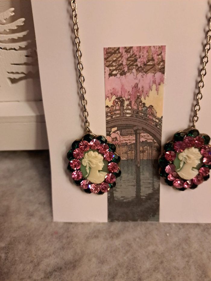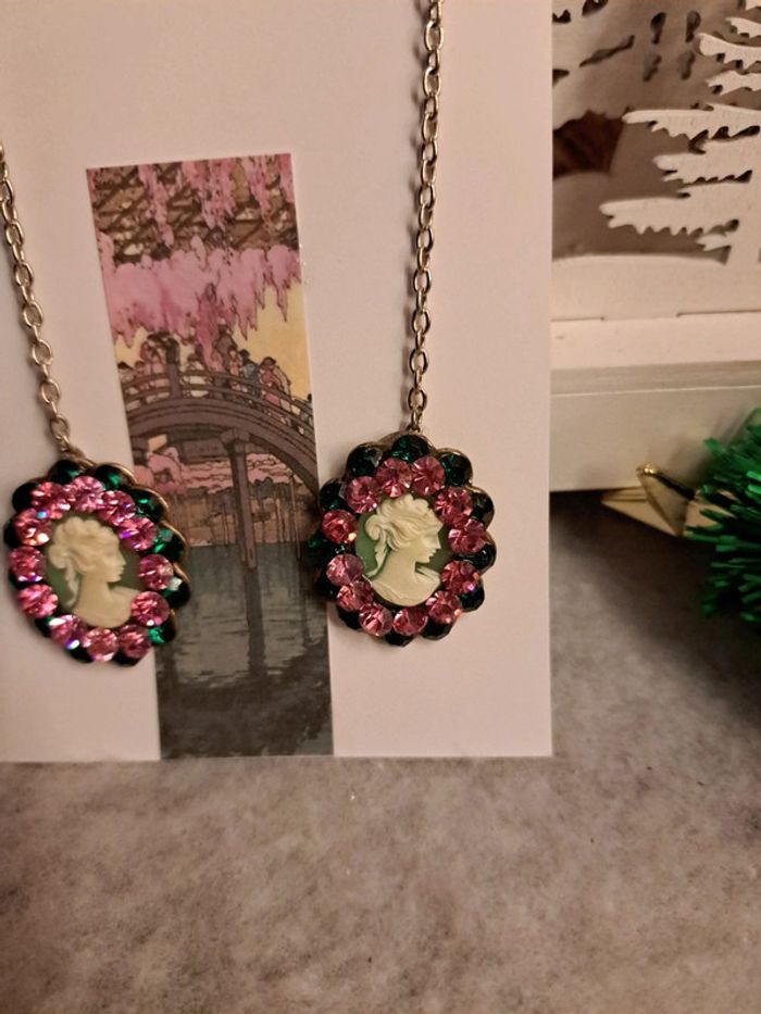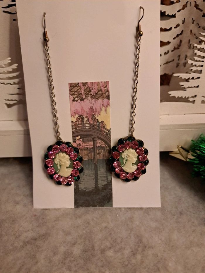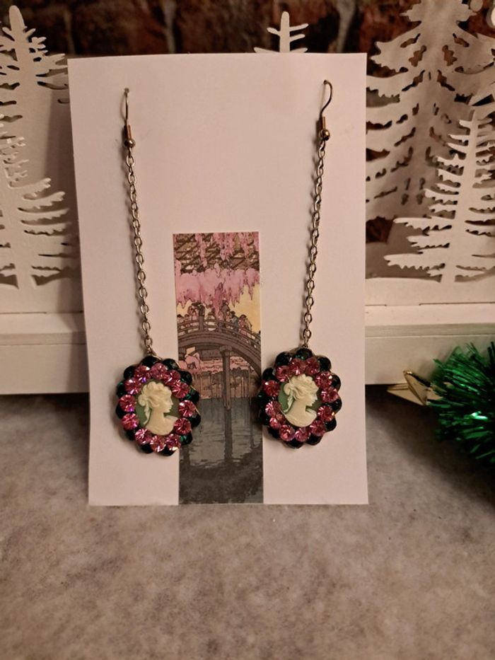 Magnifique paire de boucles d'oreilles pendante camé avec strass vert et rose Chic
