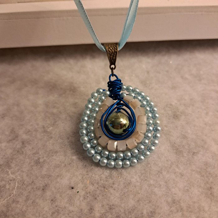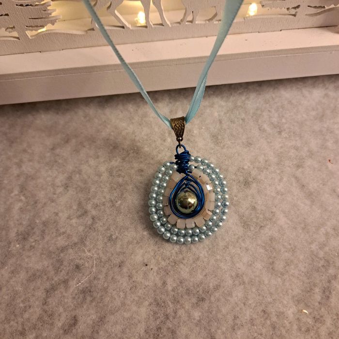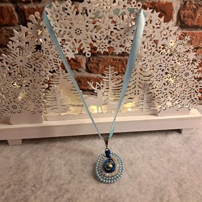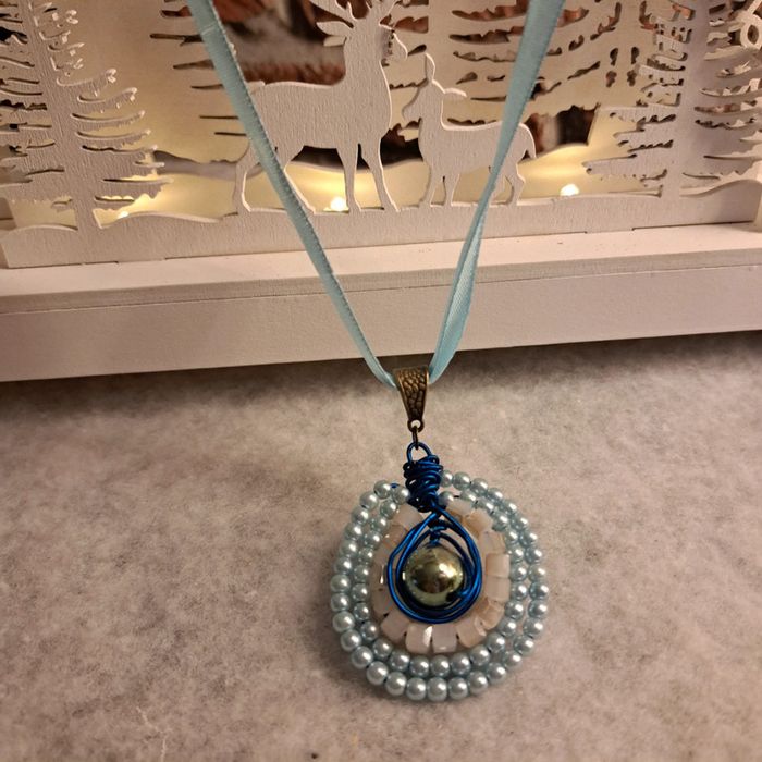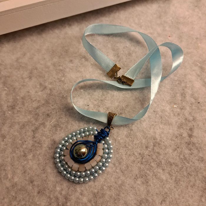 Collier avec jolie petit ruban bleu ciel et son jolie petit pendentif en aluminium bleu roy et perles petite ronde nacré bleu clair et petite perles cubes beige en verre Simple et jolie
