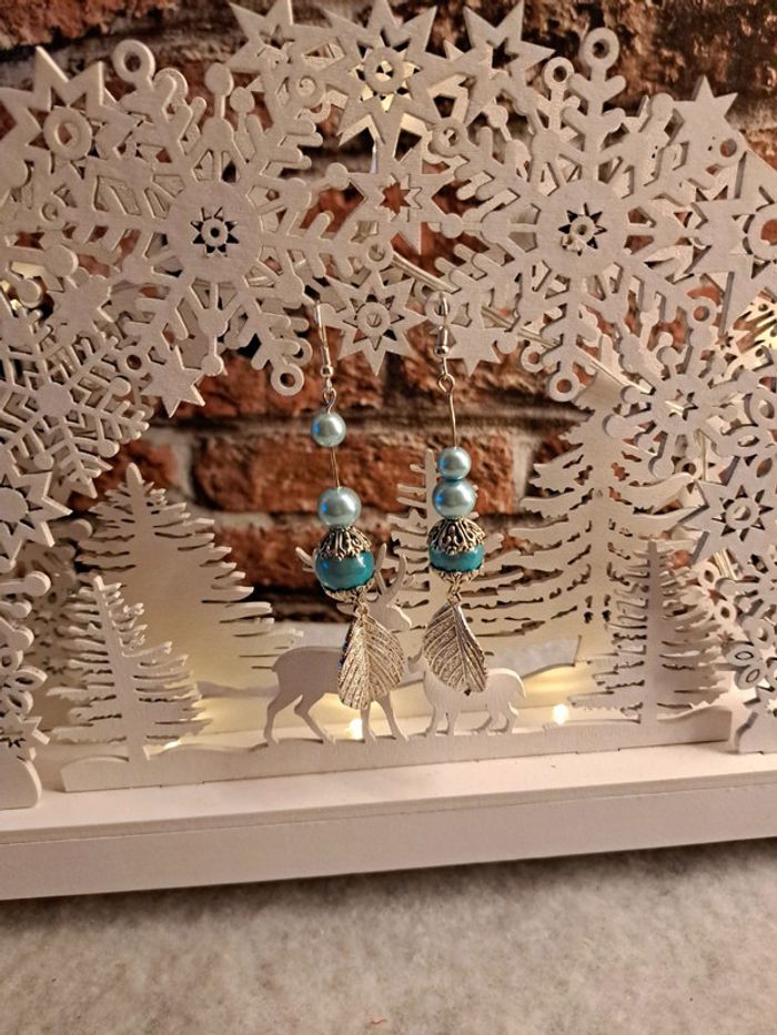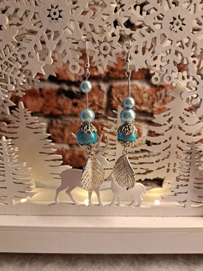 Boucles d'oreilles pendante feuilles argenté et bleu