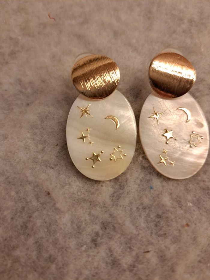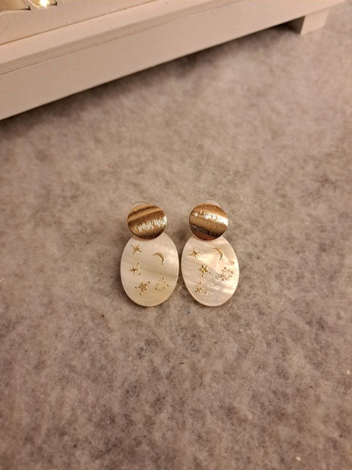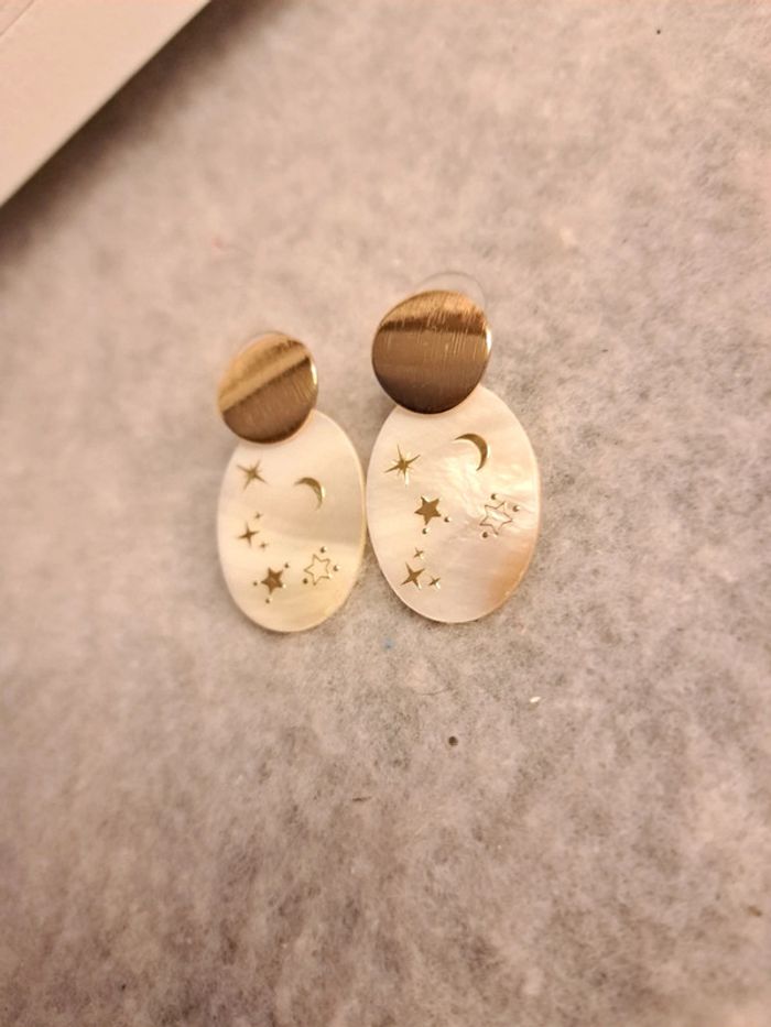 Jolie paire de boucles d'oreilles pendante en nacre avec stickers étoile 🌟 crème blanc doré Magnifique