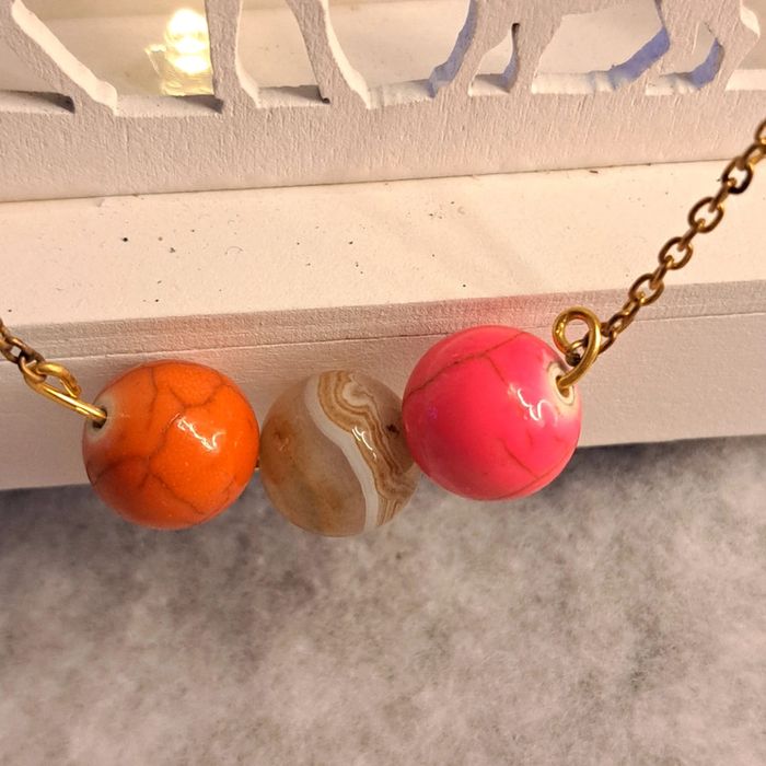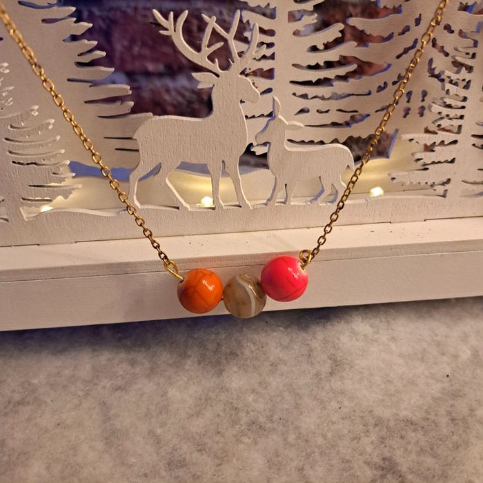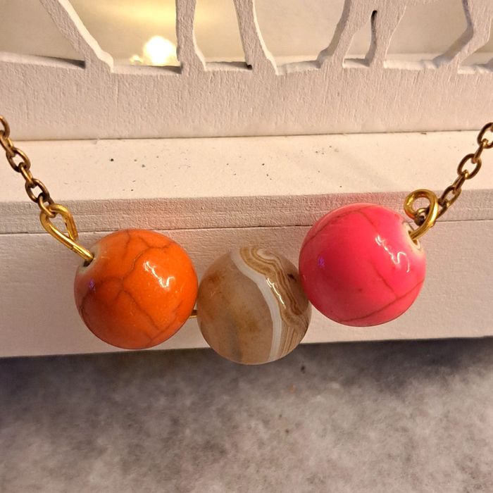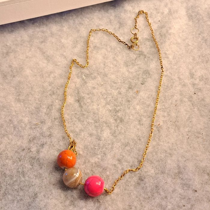 Collier simple mais jolie perles orange marron et rose sur chaîne doré Regardé bien la chaîne dernière photo chaîne décoloré mais reste jolie petit prix