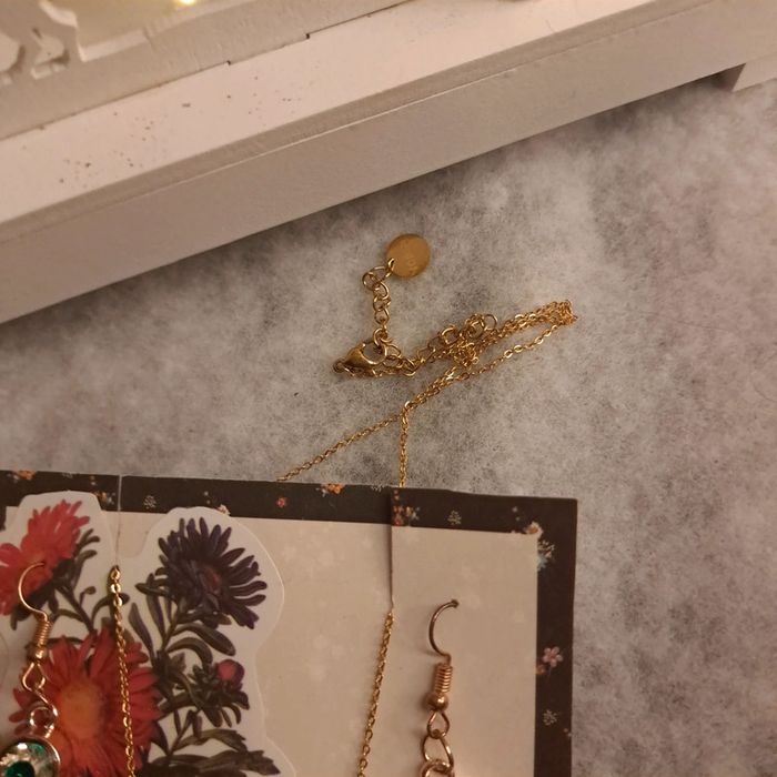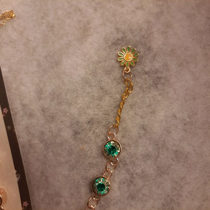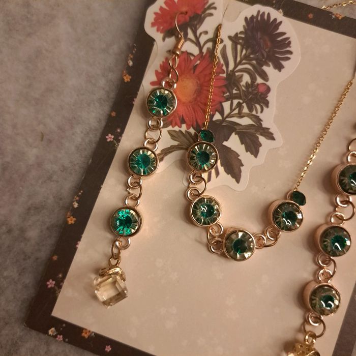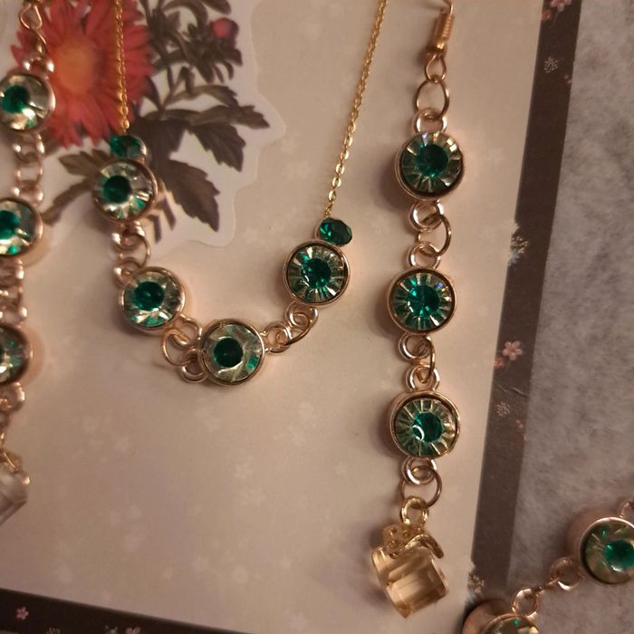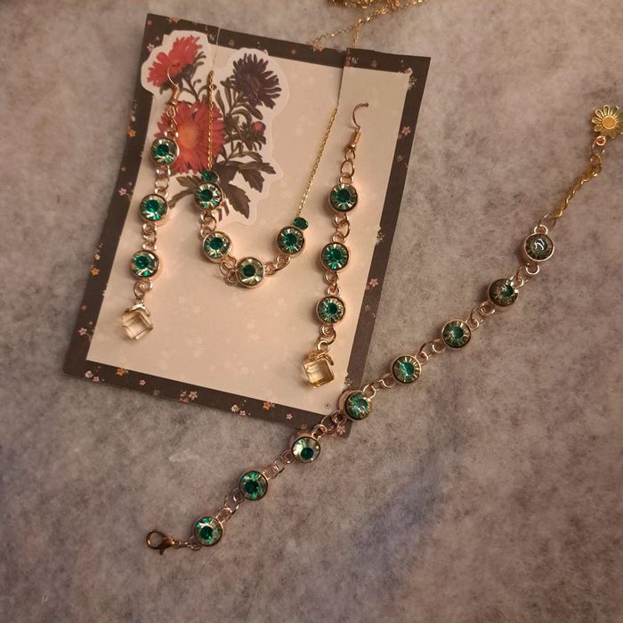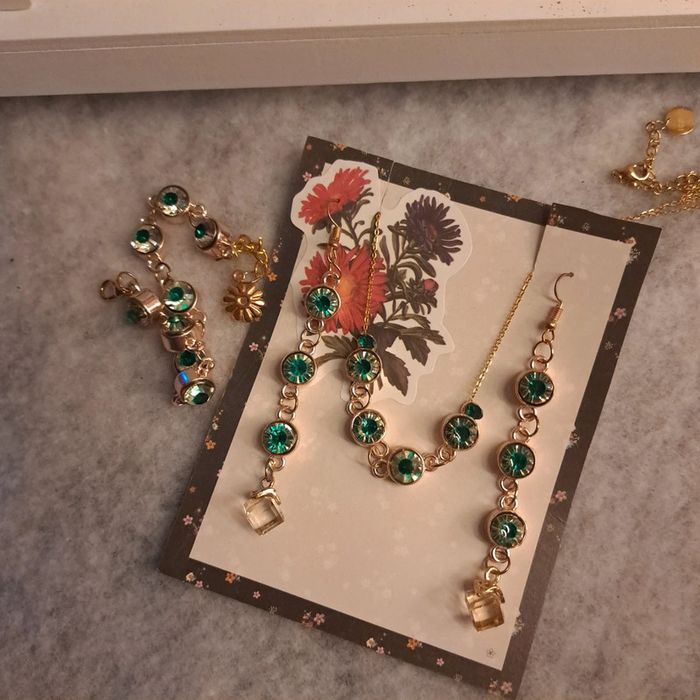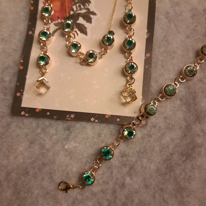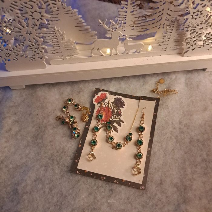 Parrurre complètes comprenant Bracelet strass vert Boucles d'oreilles pendante strass vert Collier chainette doré strass vert Magnifique idée cadeau pour Noël 💡 🎅