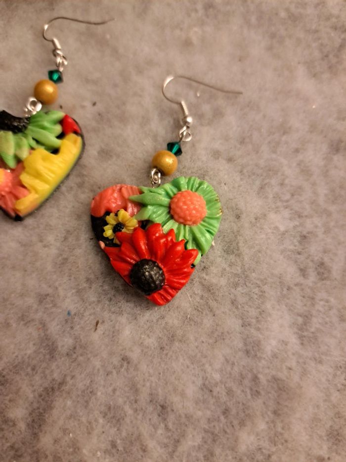 Boucles d'oreilles pendante cœur multicolore pâte polymere - photo numéro 7