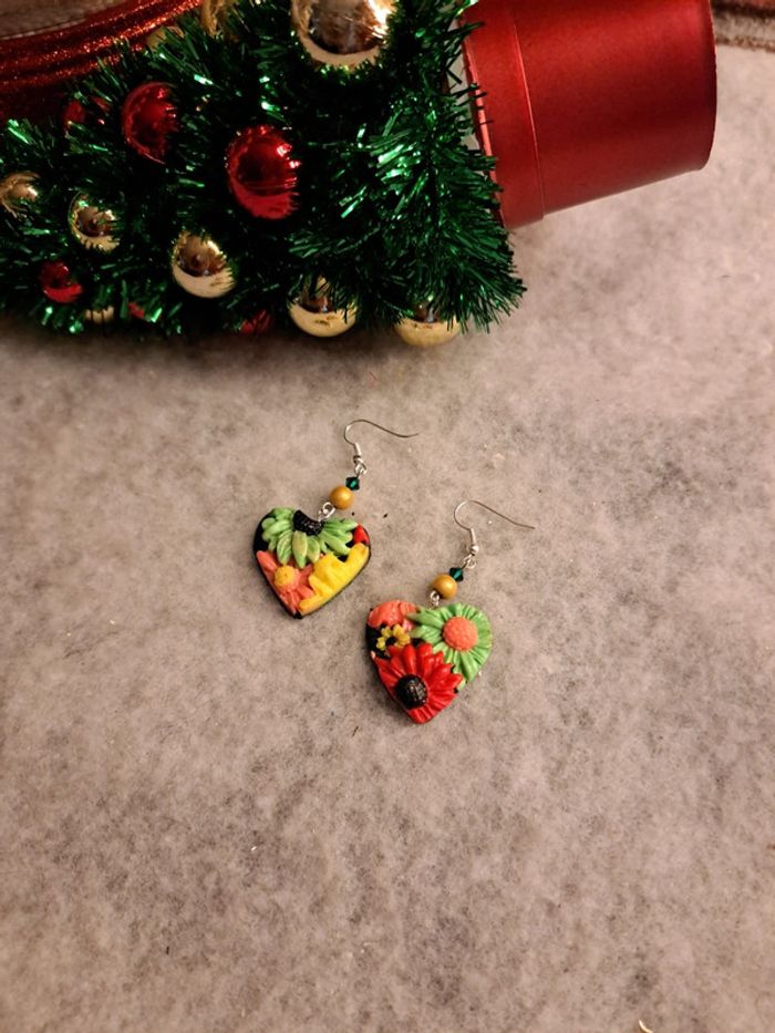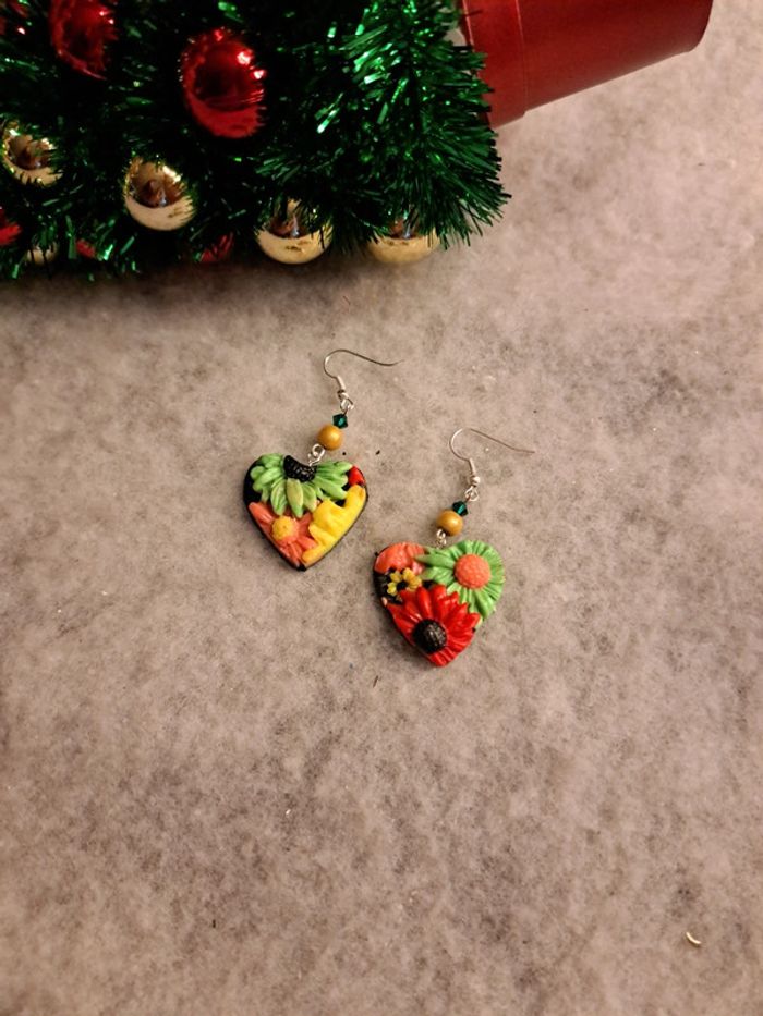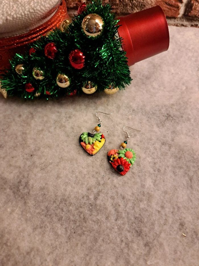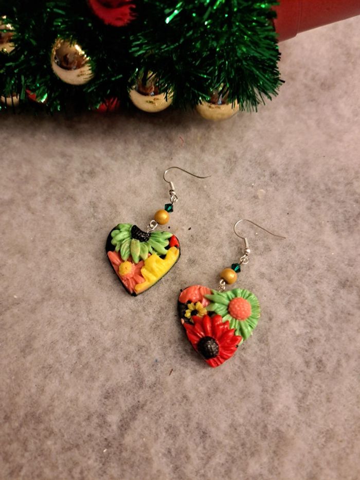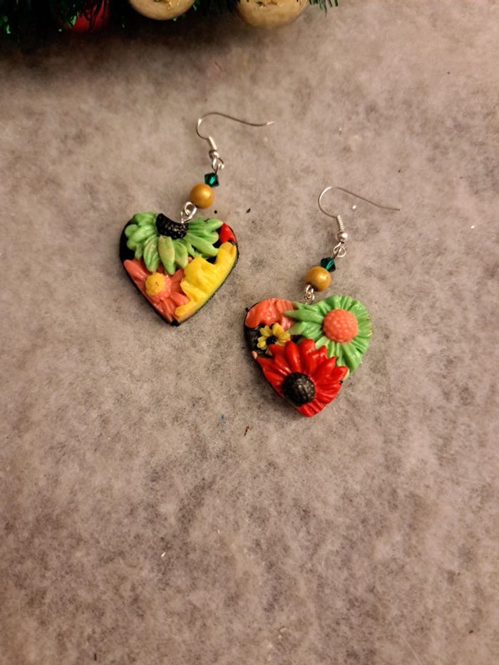 Jolie paire de boucles d'oreilles pendante avec pâte polymere florale multicolore Forme cœur Champêtre bohème