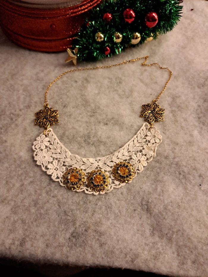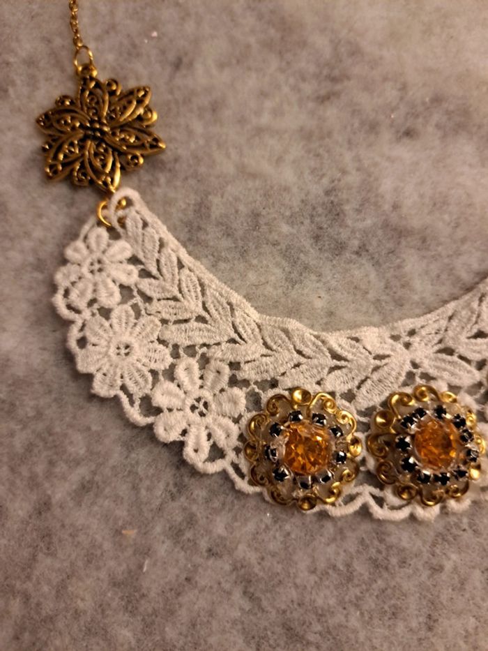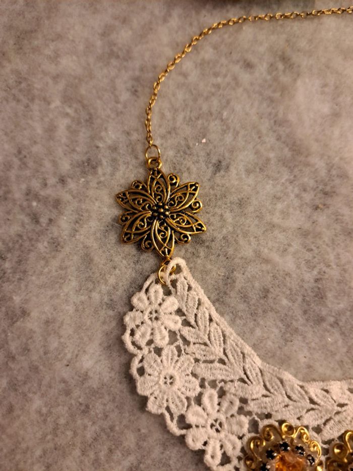 Collier avec chaînette doré et plastron dentelle blanche et strass orange noir et blanc Magnifique artisanale