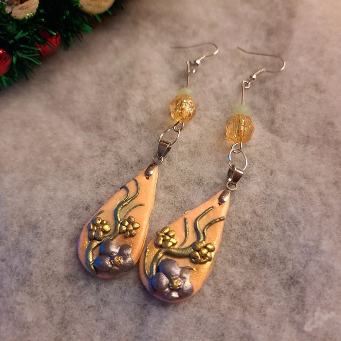 Boucles d'oreilles pendante avec pâte polymere forme gouttes florale fine et esprit bohème Unique et original