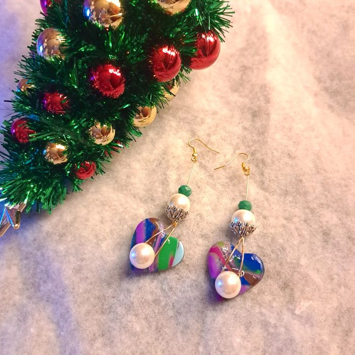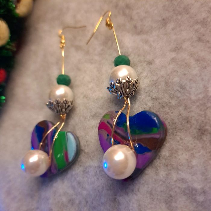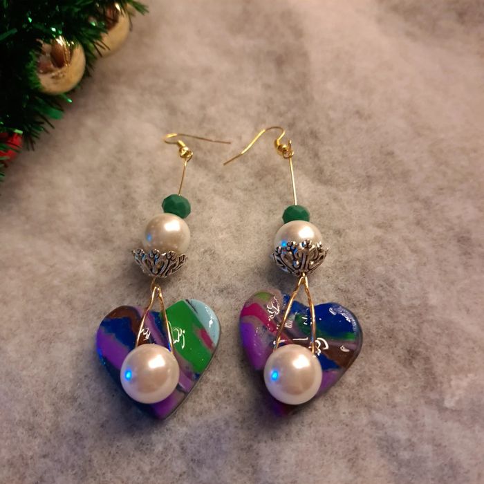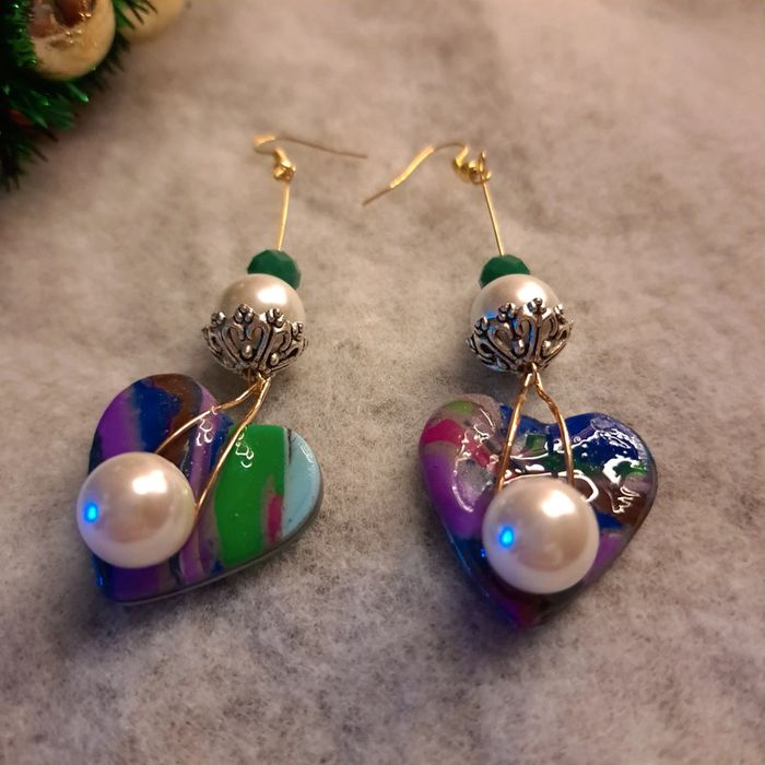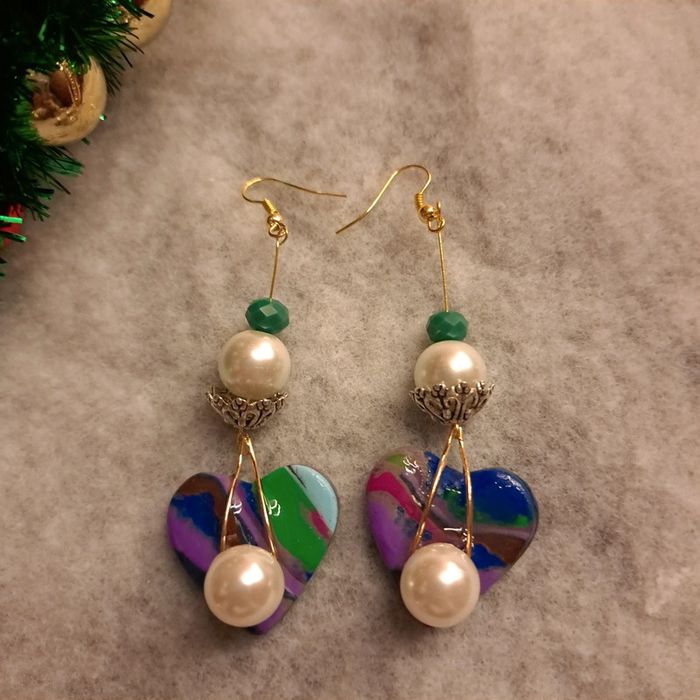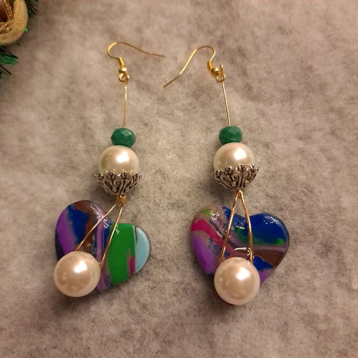 Boucles d'oreilles pendante très original avec pâte polymere multicolore et originalité sur le cœur avec perles nacré blanche Unique et original