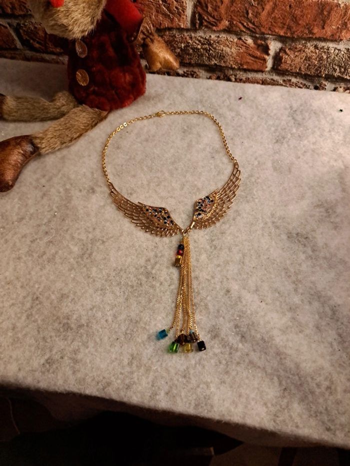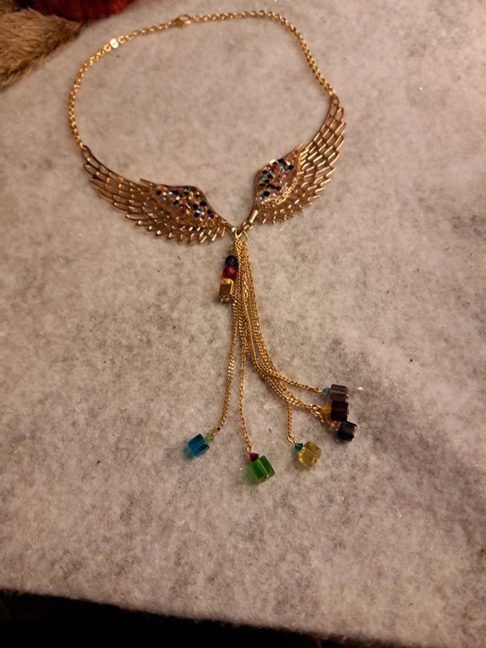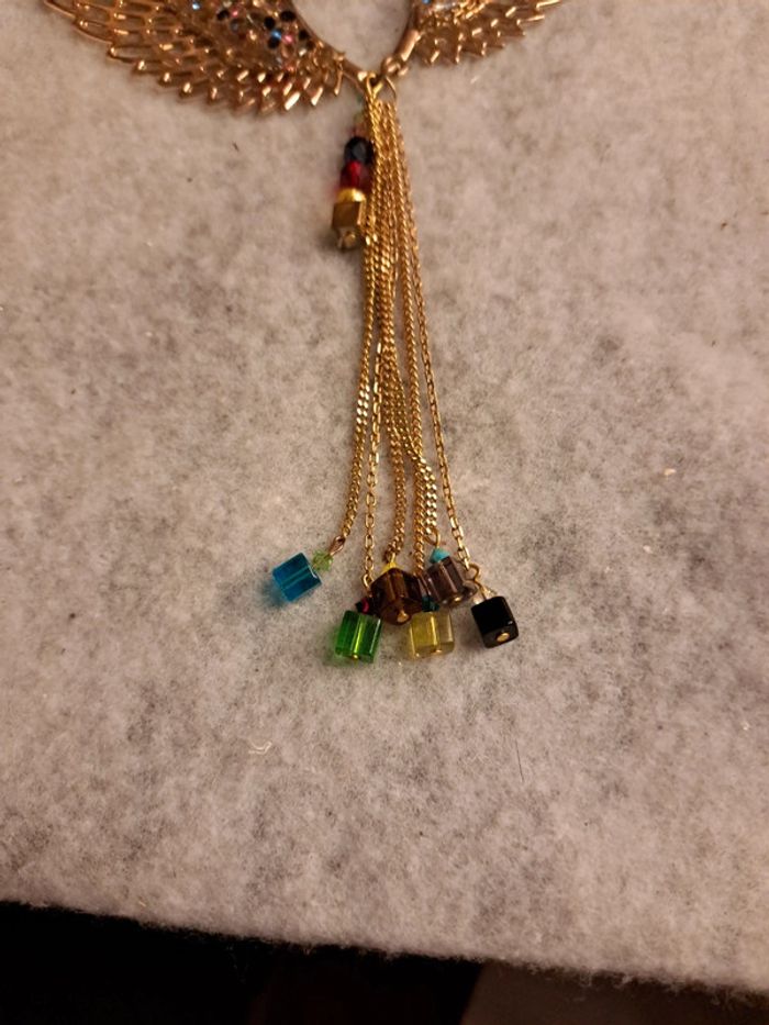 Collier avec grande ailes d'ange strass multicolore avec cascade de chaînette et perles carré multicolore en verre Magnifique et original