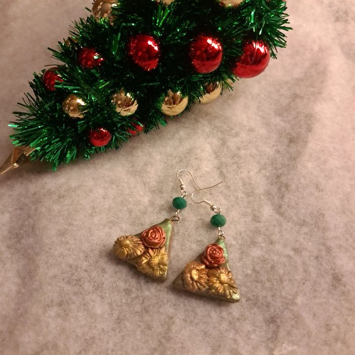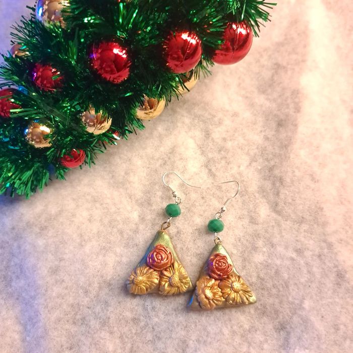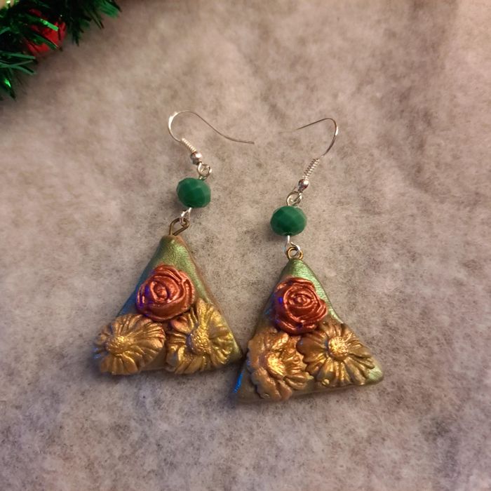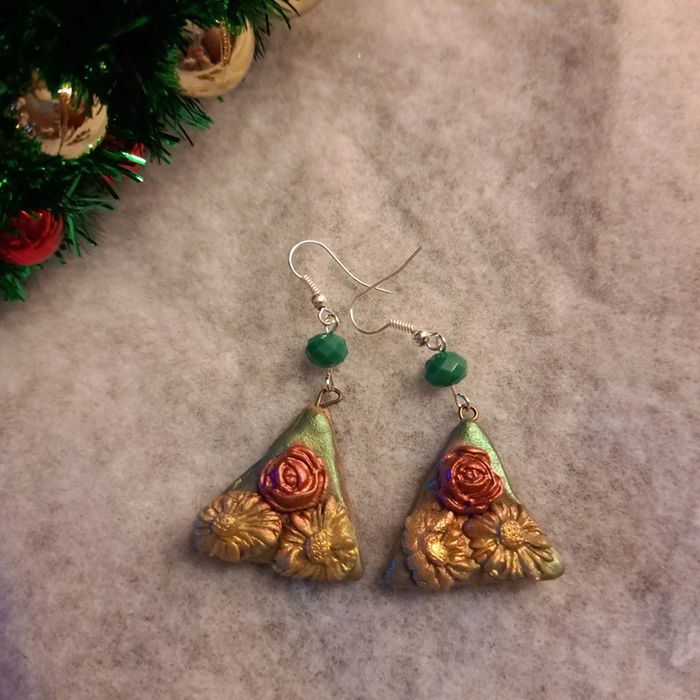 Boucles d'oreilles pendante avec pâte polymere forme triangle multicolore florale Original et unique