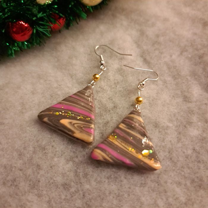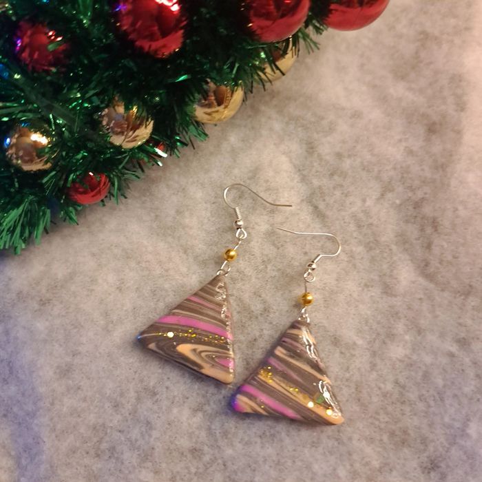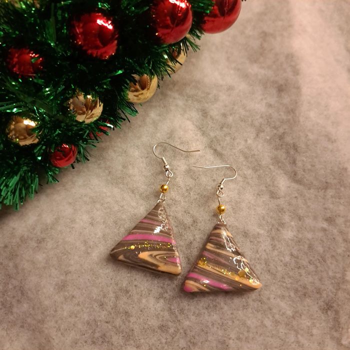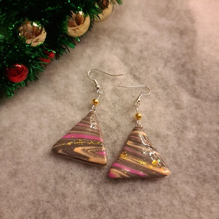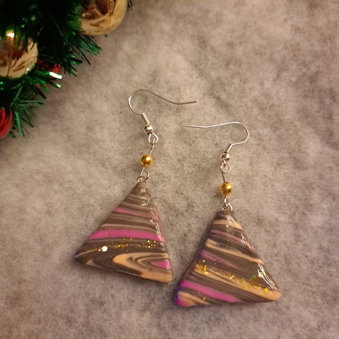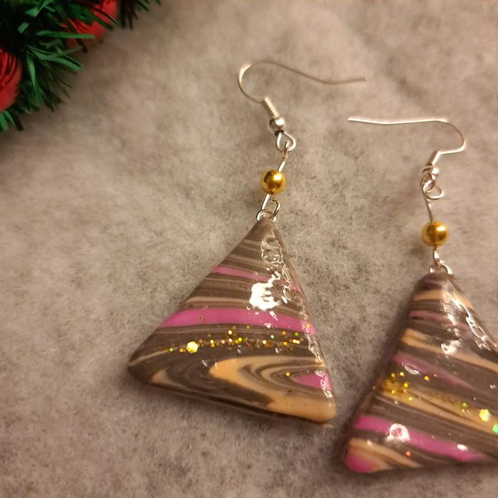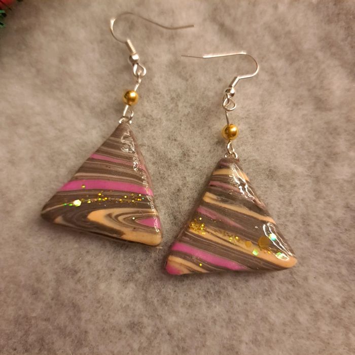 Boucles d'oreilles pendante avec pâte polymere multicolore et paillettes forme triangle Très jolie original