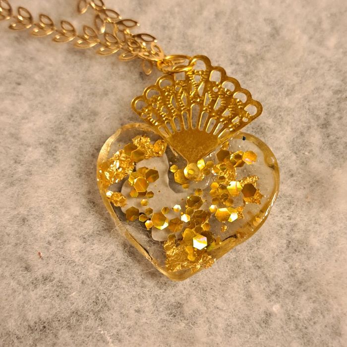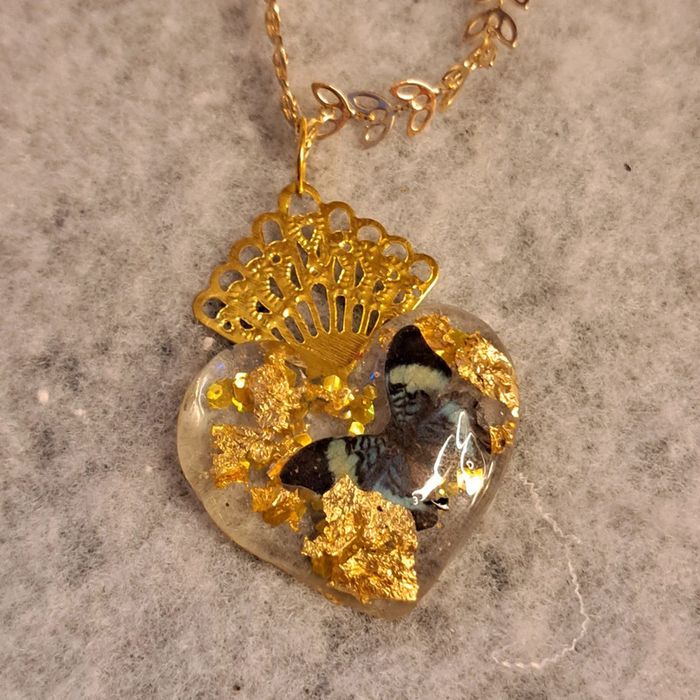 Très jolie collier chainette original style petite feuille 🍃 avec pendentif cœur en résine inclusion papier papillons 🦋 et paillettes d'or Délicat et tout en finesse