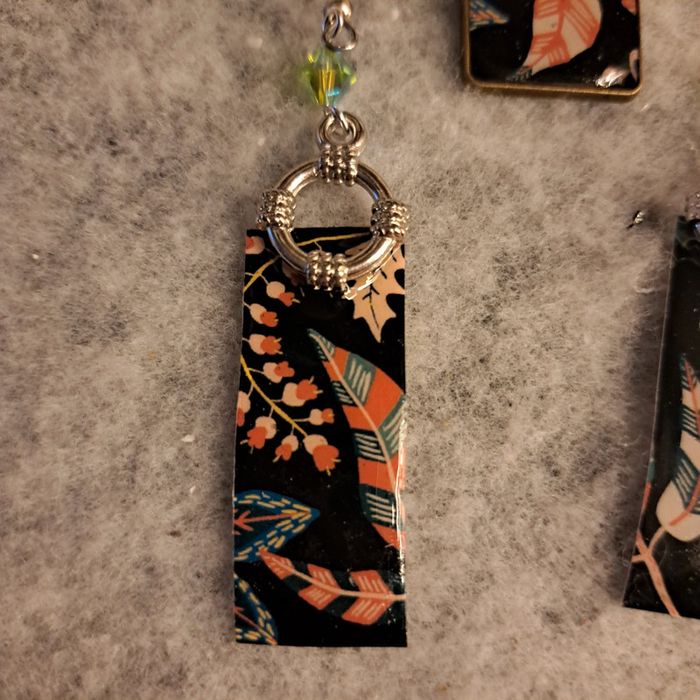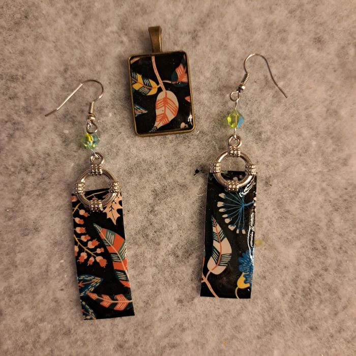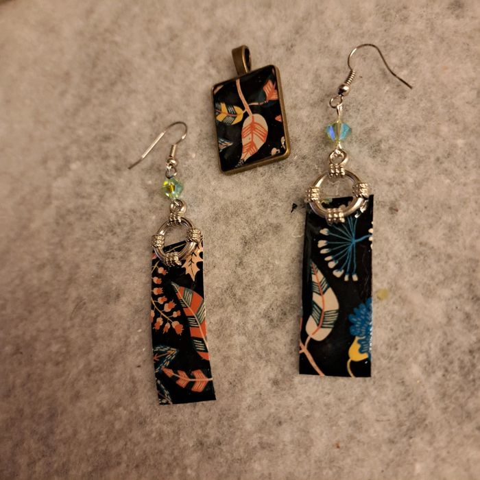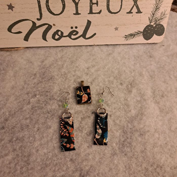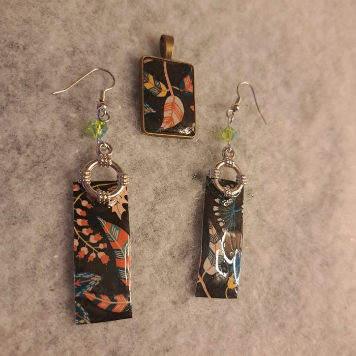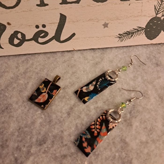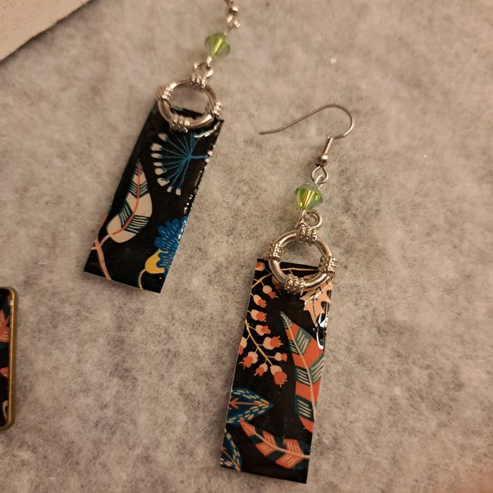 Jolie boucles d'oreilles pendante en résine avec inclusion papier florale multicolore sur fond noir rectangulaire avec pendentif assortie Très jolie ensemble et léger