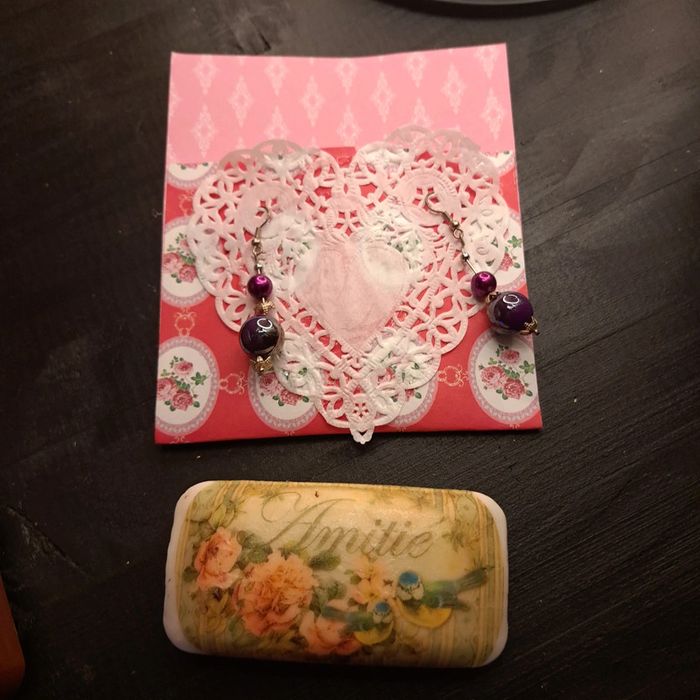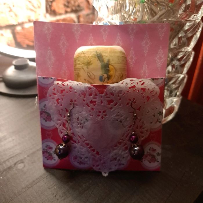 Pochette surprise Pochette offrant une paire de boucles d'oreilles pendante et un savon bonne senteurs thème amitié à offrir pour Noël