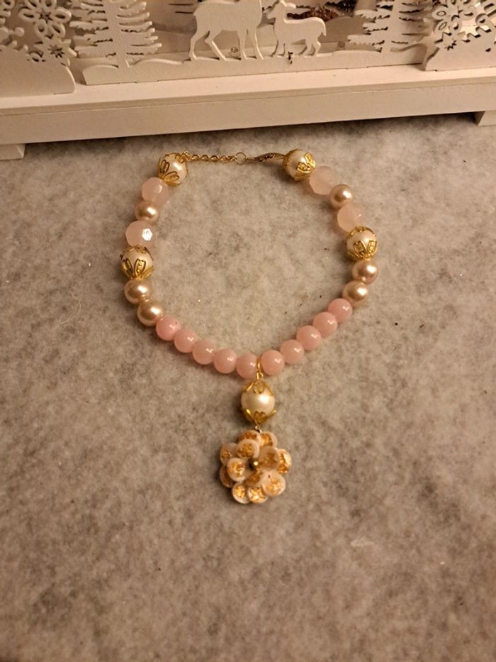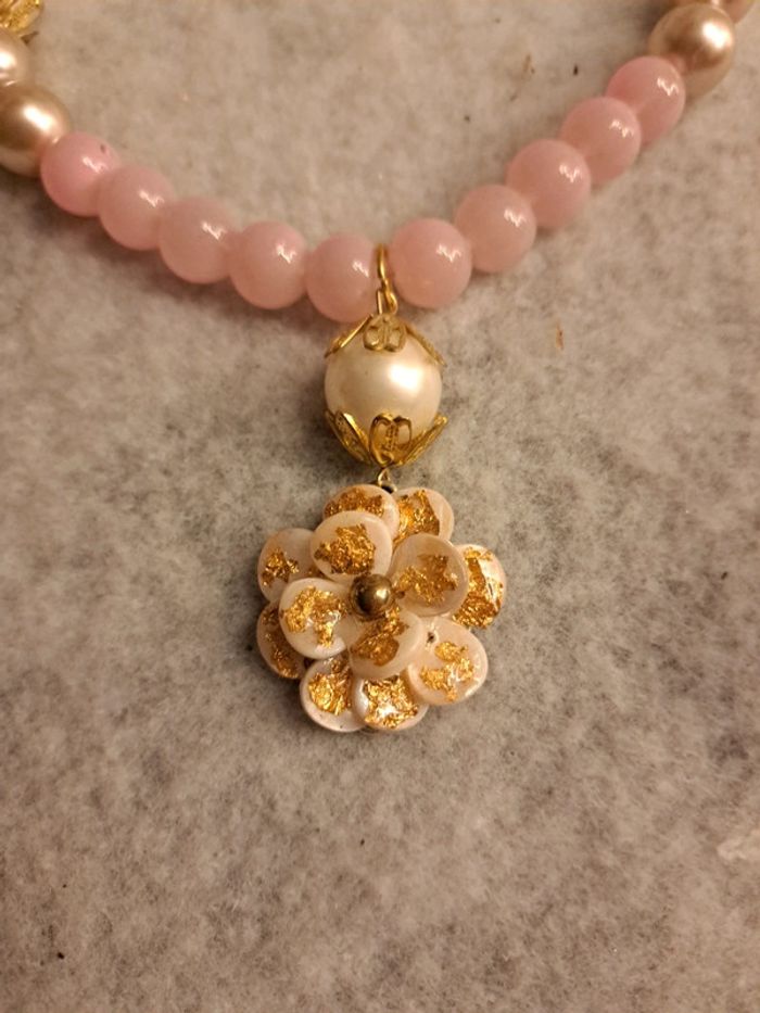 Magnifique collier ras de cou perles rose pastel avec perles blanches et beige nacré coupelle doré pendentif fleur blanche et doré Très jolie