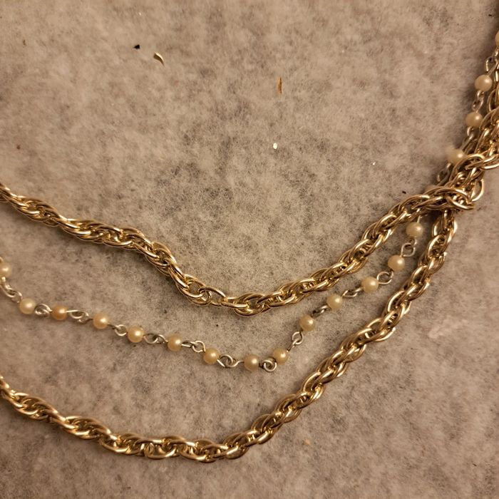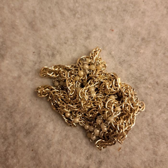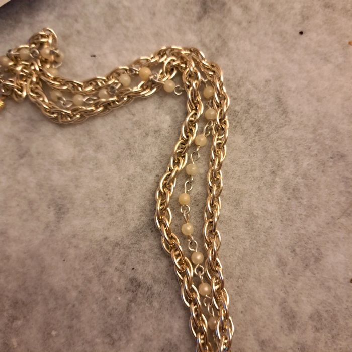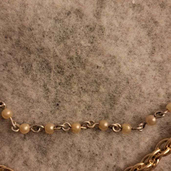Long collier avec chaînette argenté et chaînette avec petite perles beige Vintage
