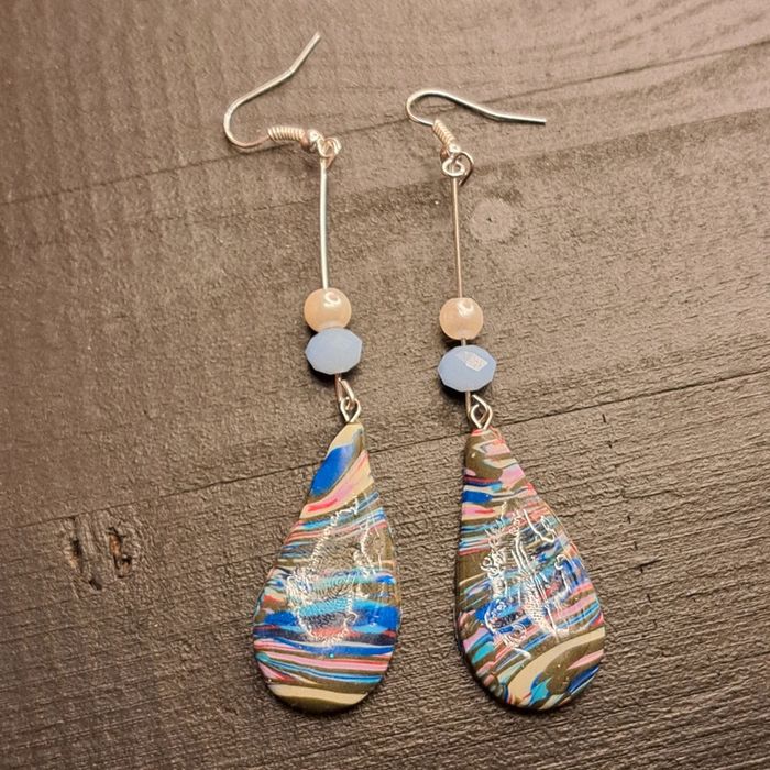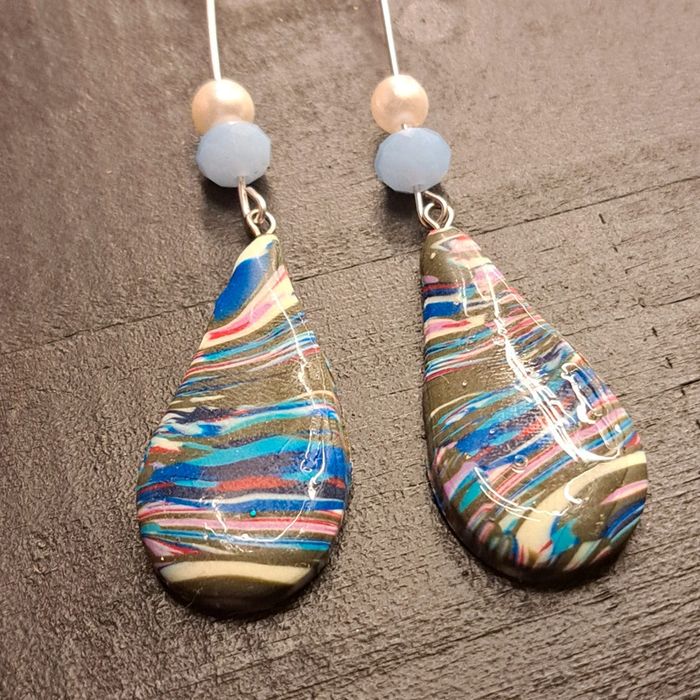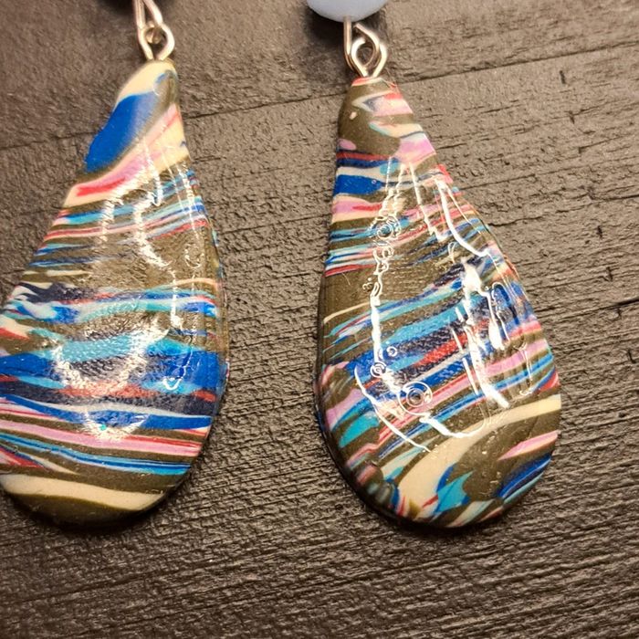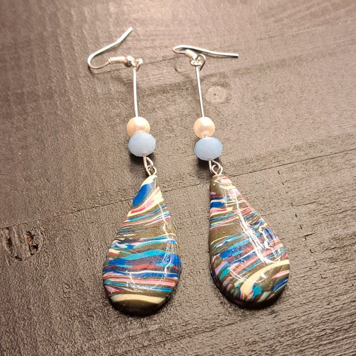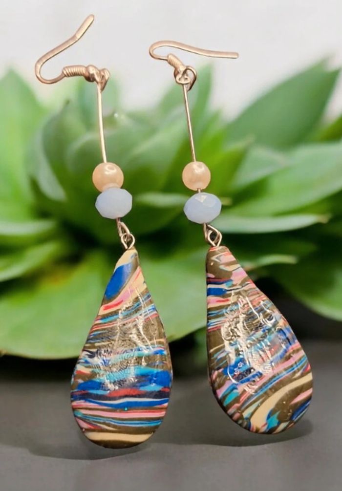 Boucles d'oreilles pendante avec pâte polymere multicolore à rayures forme gouttes Unique original