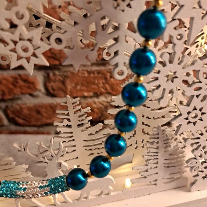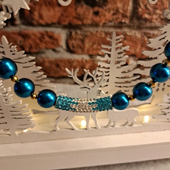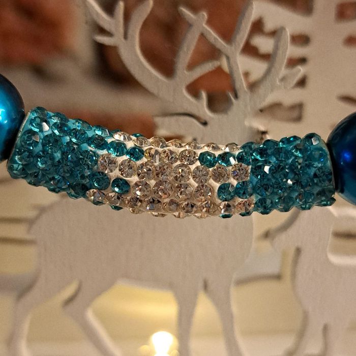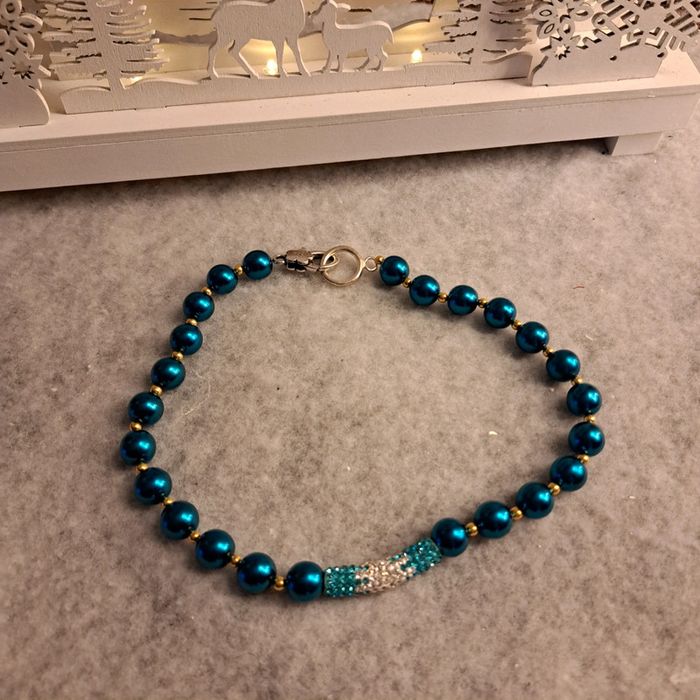Très jolie collier ras de cou perles doré petites avec perles ronde nacré bleu strass bleu et blanc Magnifique