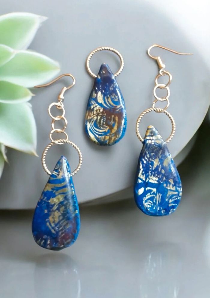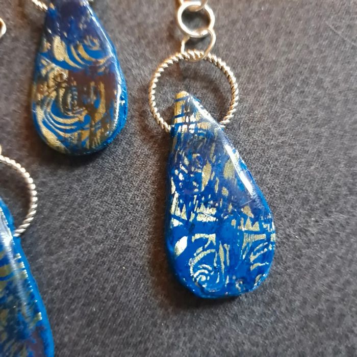 Boucles d'oreilles pendante avec pendentif assortie pâte polymere Bleu avec stickers arabesque doré finition résine Original et unique #boucles d'oreilles pendantes # boucles d'oreilles bleu et noir #boucles d'oreilles polymere #boucles d'oreilles fantaisies #boucledoreille # boucles d'oreilles Bohème #boutiqueindependante #bouclesdoreillespendantes #boucles d'oreilles résine #boucles d'oreilles multicolore