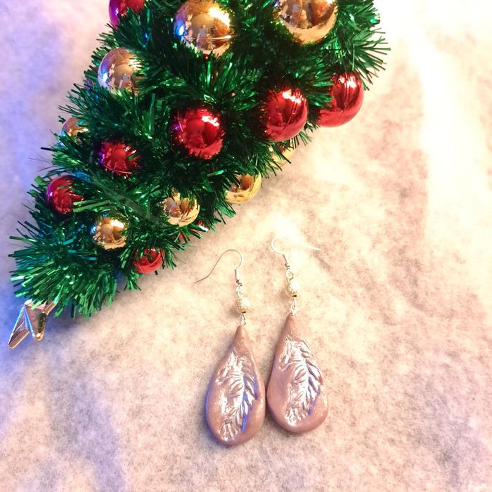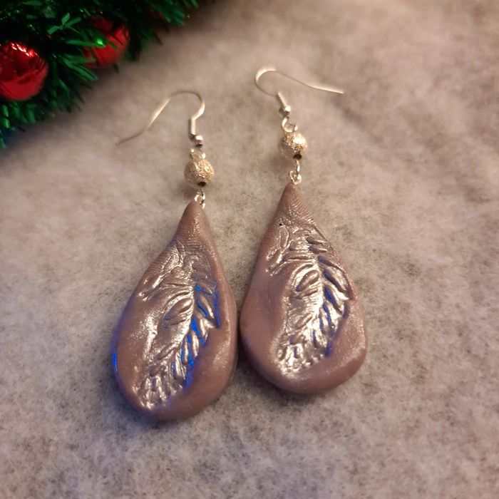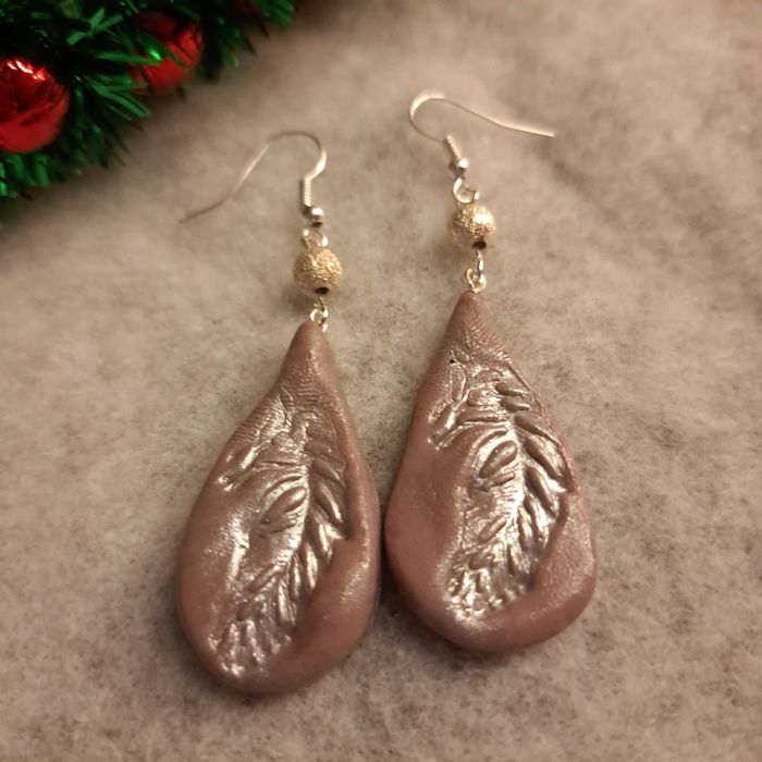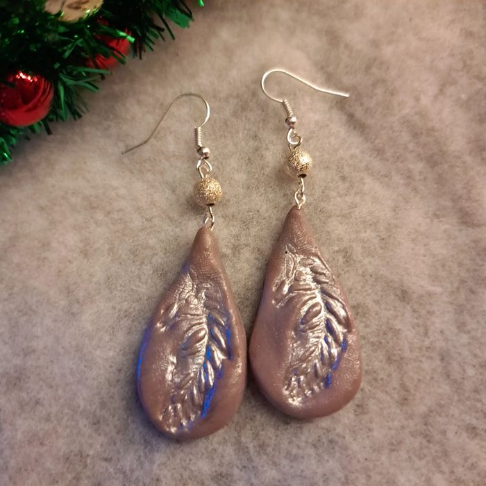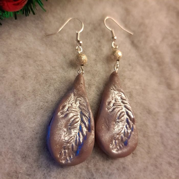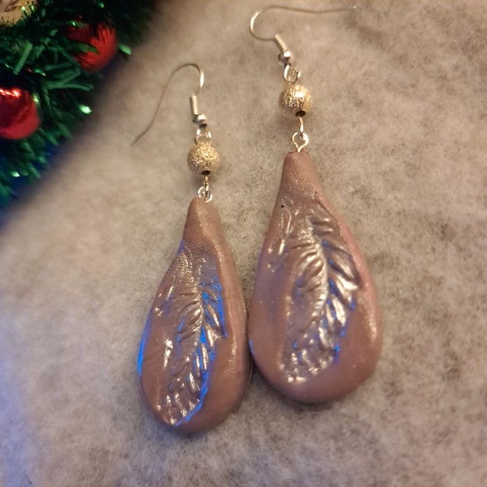 Boucles d'oreilles pendante avec pâte polymere marrons clair avec empreinte plume simple et original