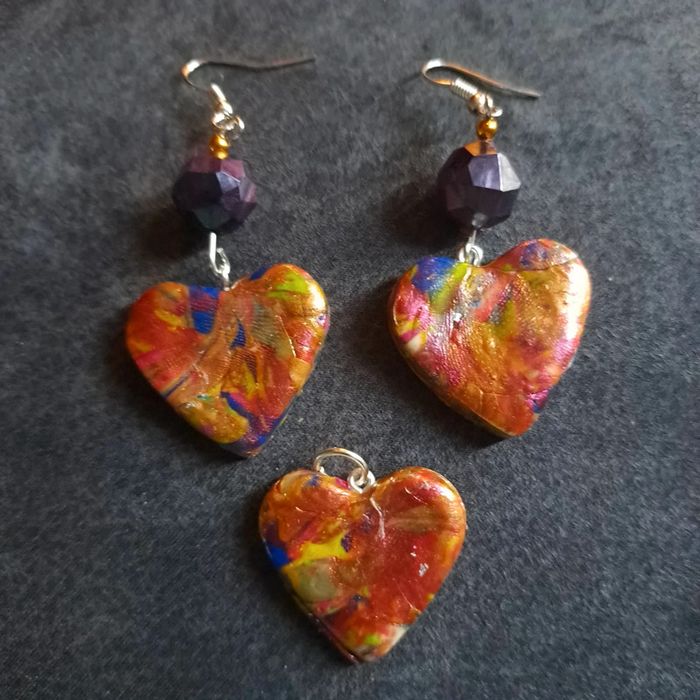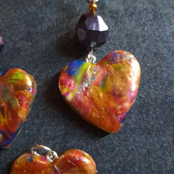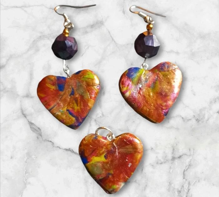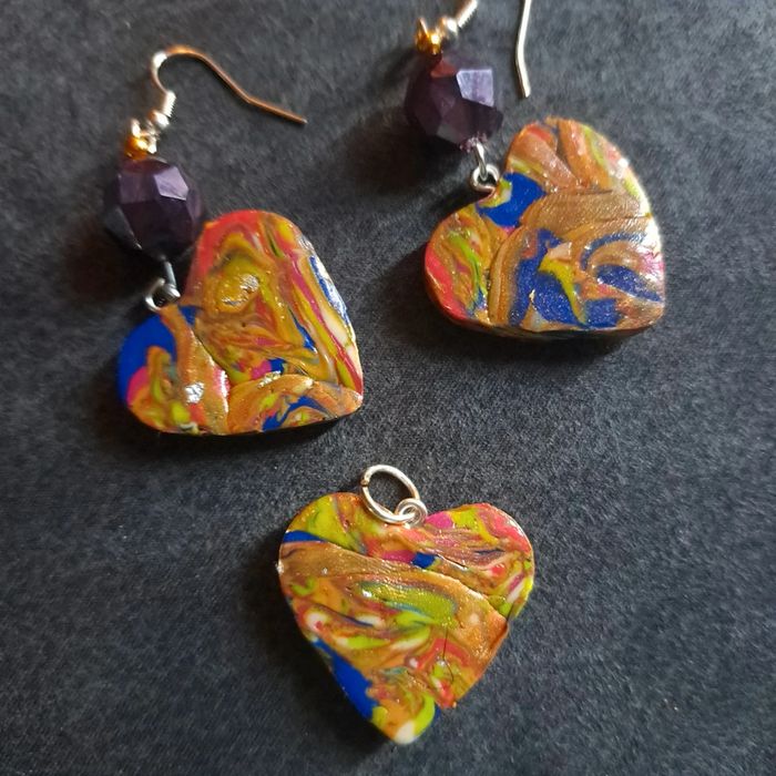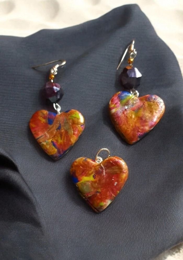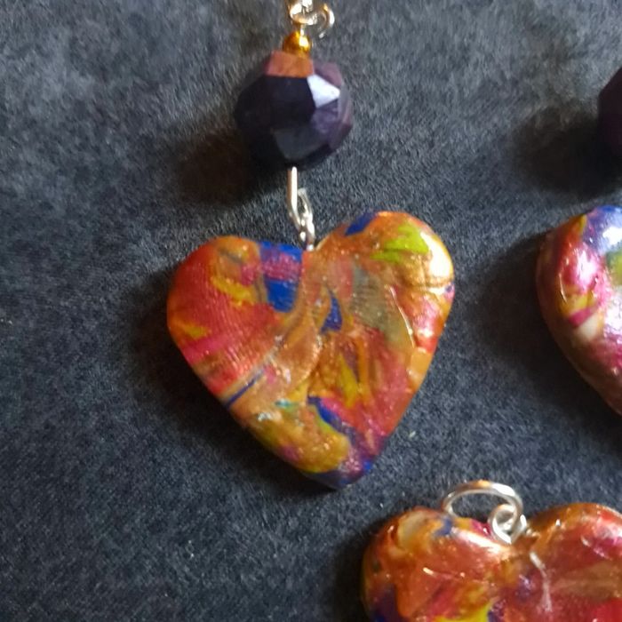 Boucles d'oreilles pendante avec pendentif assortie pâte polymere multicolore Forme cœur Unique et original #boucles d'oreilles pendantes # boucles d'oreilles bleu et noir #boucles d'oreilles polymere #boucles d'oreilles fantaisies #boucledoreille # boucles d'oreilles Bohème #boutiqueindependante #bouclesdoreillespendantes #boucles d'oreilles résine #boucles d'oreilles multicolore #parrurre