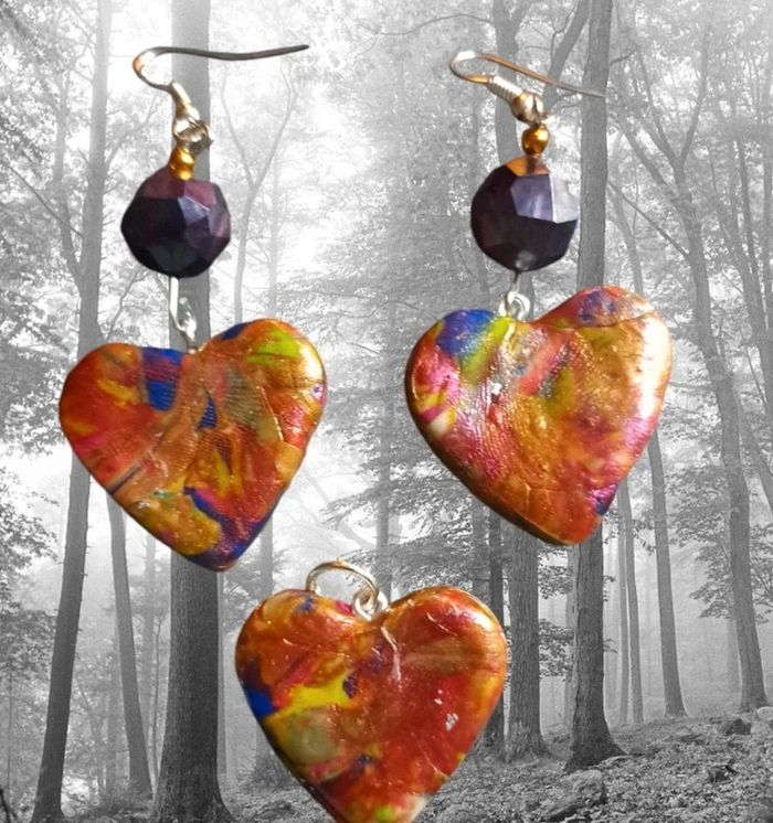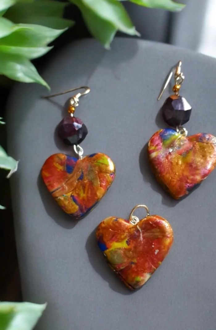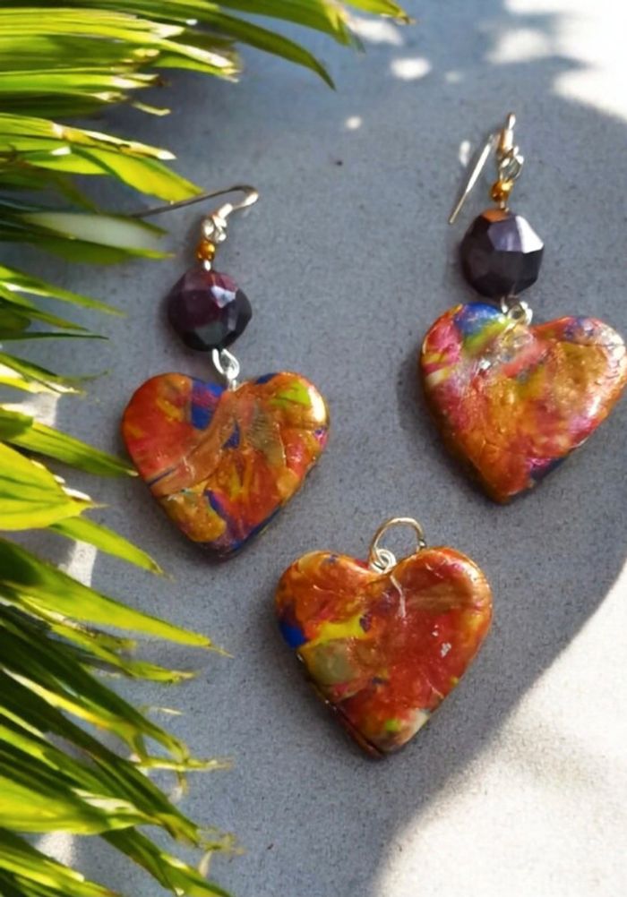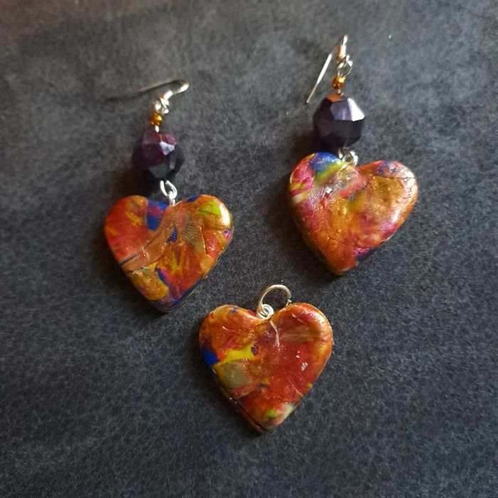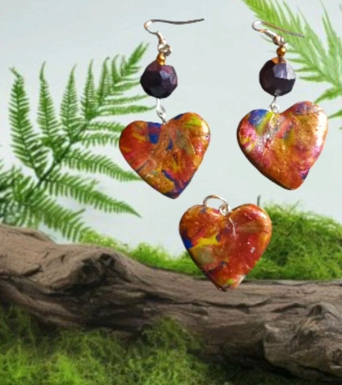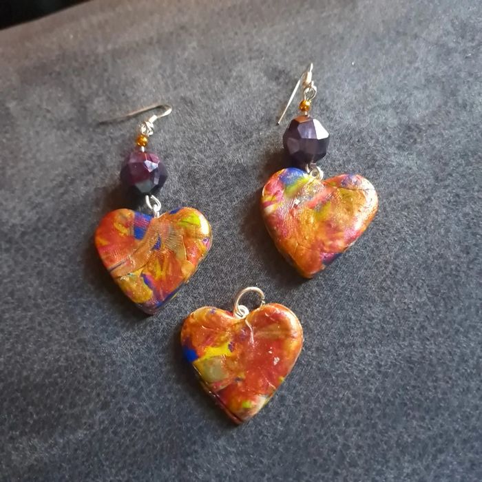 Boucles d'oreilles pendante avec pendentif assortie pâte polymere multicolore Forme cœur Unique et original #boucles d'oreilles pendantes # boucles d'oreilles bleu et noir #boucles d'oreilles polymere #boucles d'oreilles fantaisies #boucledoreille # boucles d'oreilles Bohème #boutiqueindependante #bouclesdoreillespendantes #boucles d'oreilles résine #boucles d'oreilles multicolore #parrurre