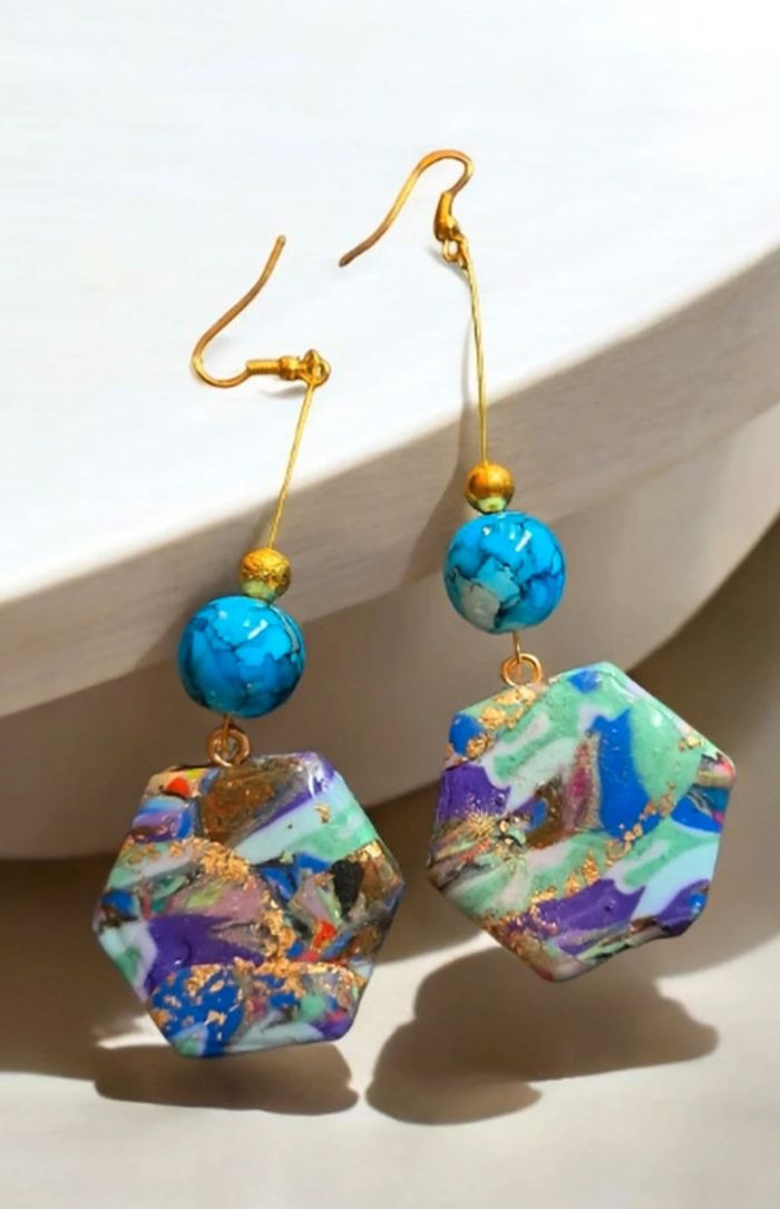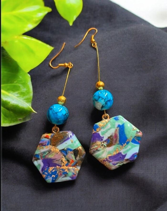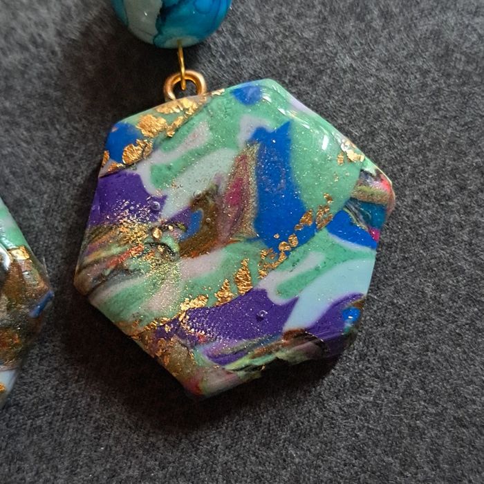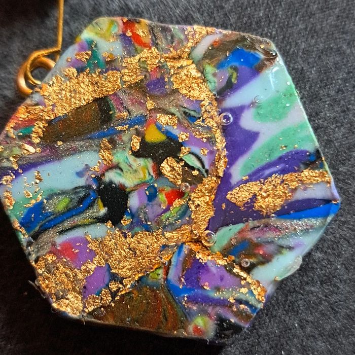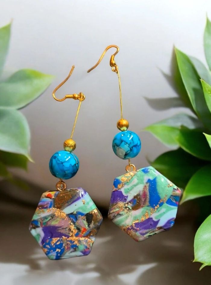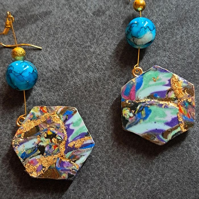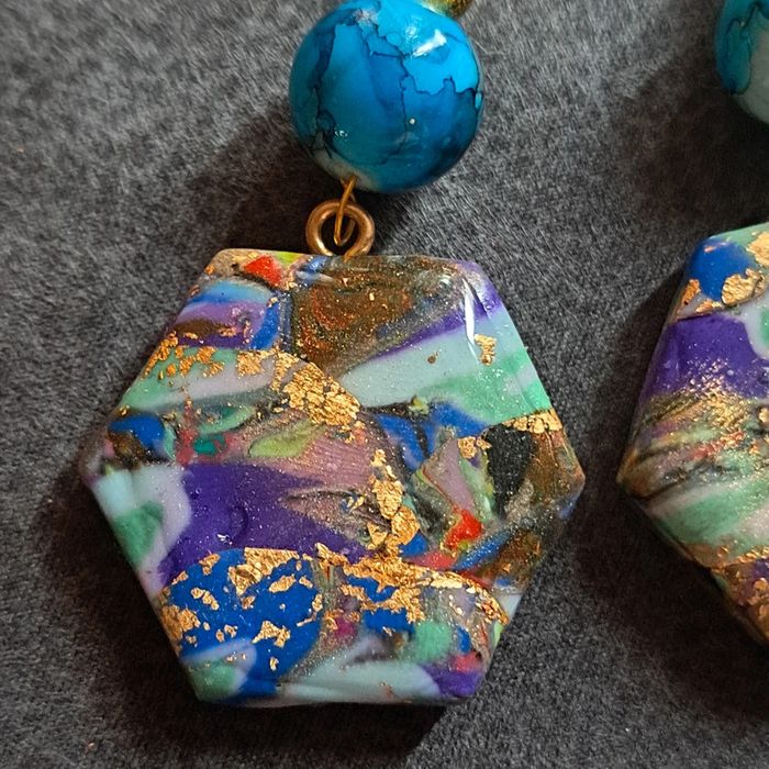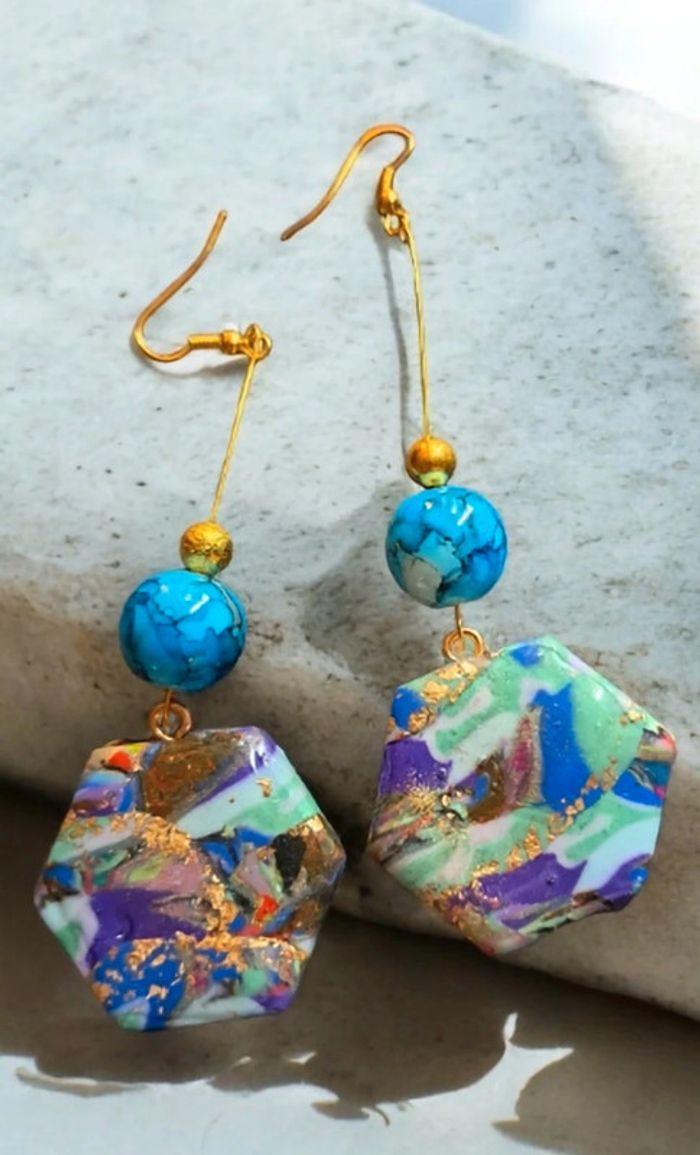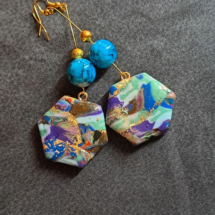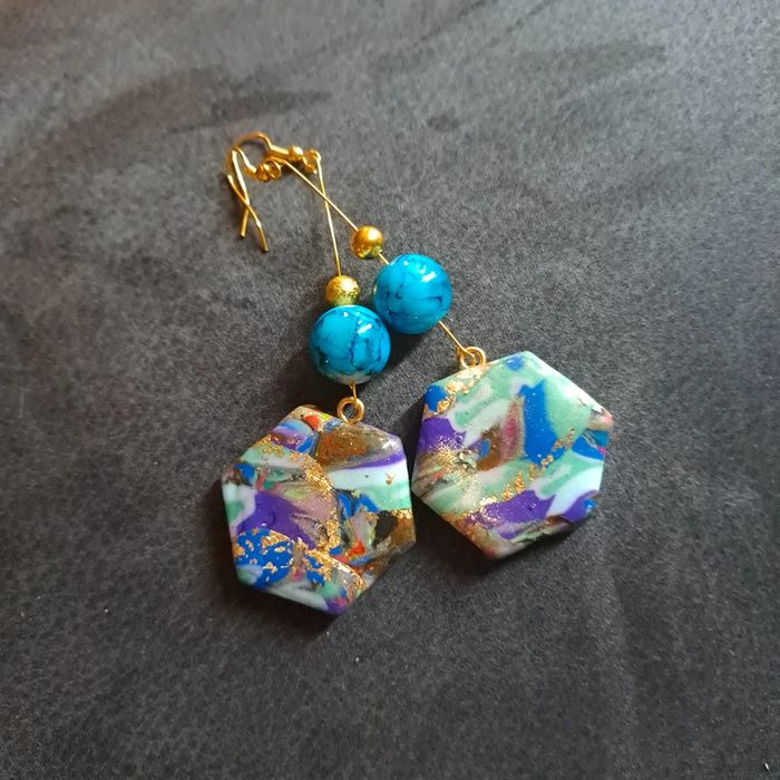 Boucles d'oreilles pendante avec pâte polymere multicolore avec paillettes doré forme hexagonale originale et unique finition résine #boucles d'oreilles pendantes # boucles d'oreilles bleu et noir #boucles d'oreilles polymere #boucles d'oreilles fantaisies #boucledoreille # boucles d'oreilles Bohème #boutiqueindependante #bouclesdoreillespendantes #boucles d'oreilles résine #boucles d'oreilles multicolore