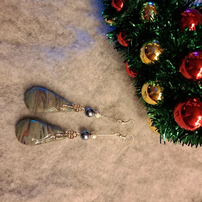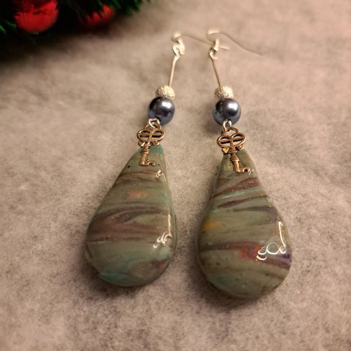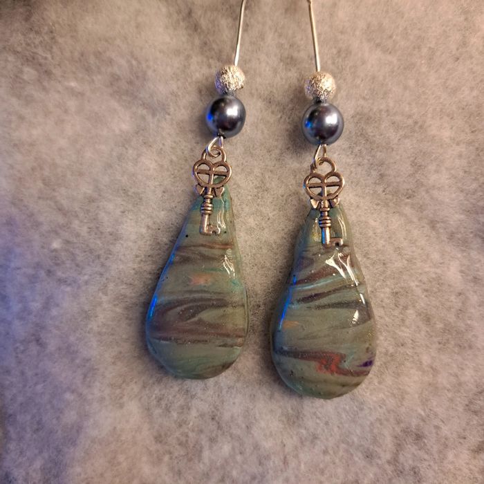 Jolie paire de boucles d'oreilles pendante avec pâte polymere multicolore avec couches de résine perles grise et argenté Unique et original