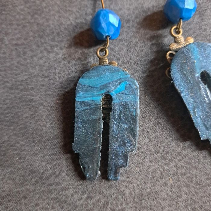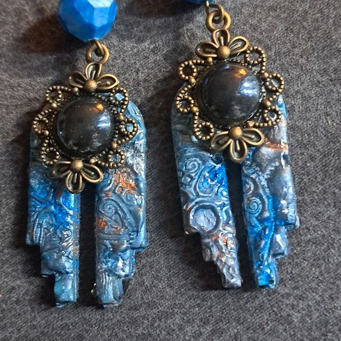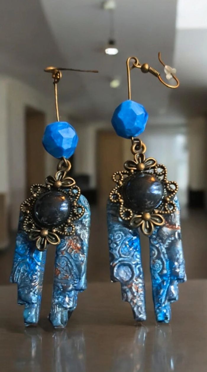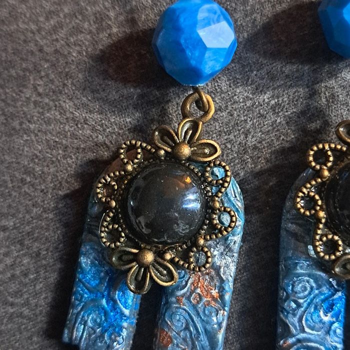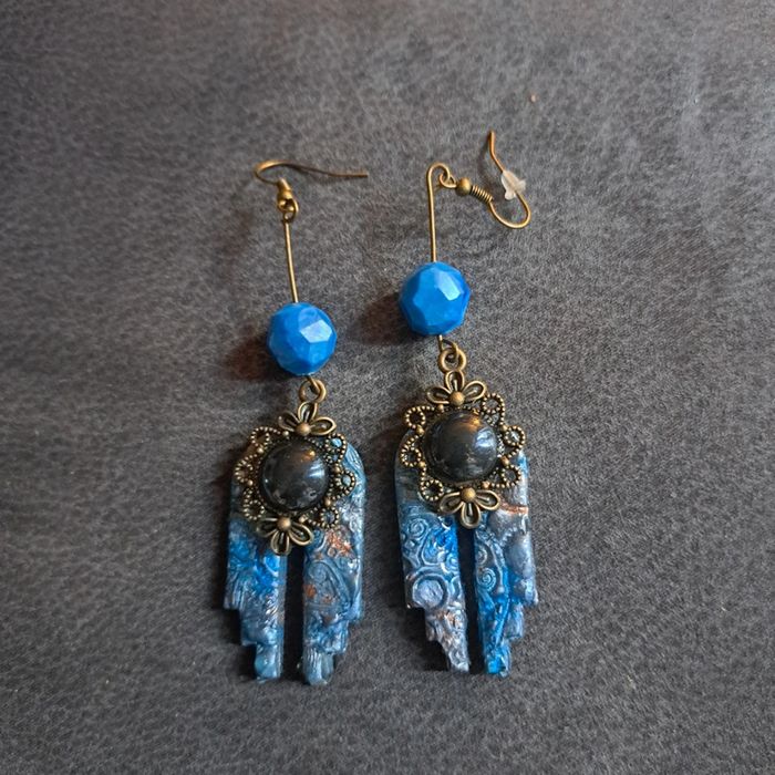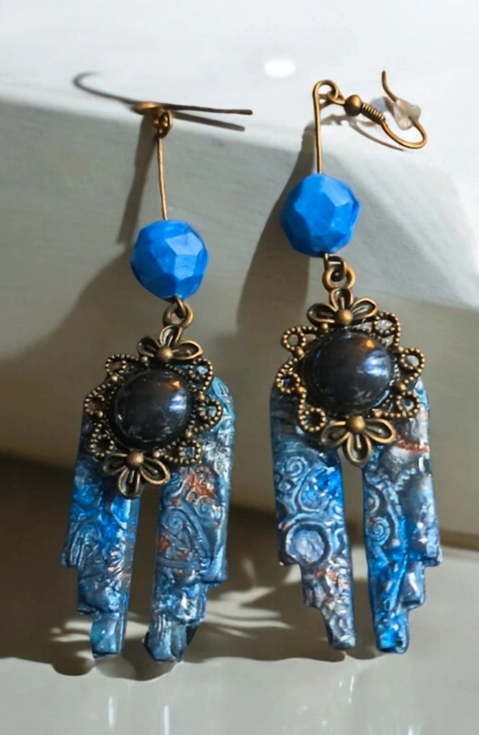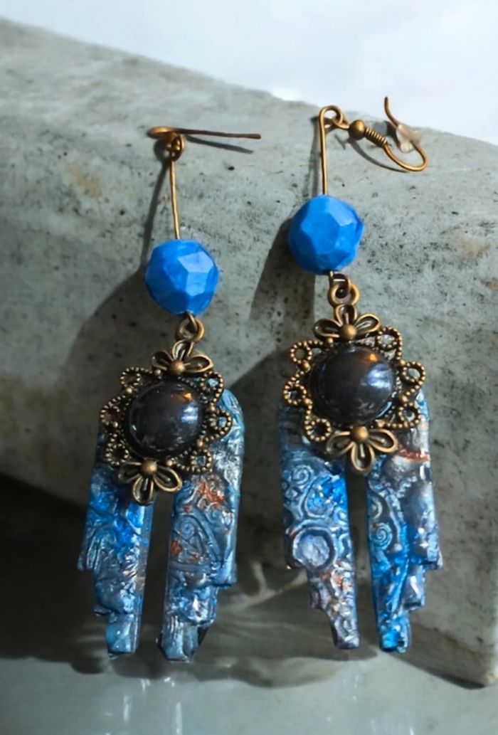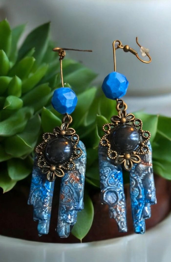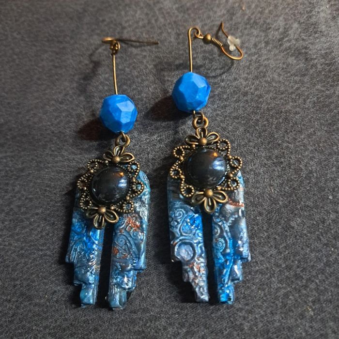 Boucles d'oreilles pendante avec pâte polymere impression baroque bleue avec paillettes bronze pendentif bronze et cabochon noir nacré Unique et original #boucles d'oreilles pendantes # boucles d'oreilles bleu et noir #boucles d'oreilles polymere #boucles d'oreilles fantaisies #boucledoreille # boucles d'oreilles Bohème #boutiqueindependante #bouclesdoreillespendantes #boucles d'oreilles résine #boucles d'oreilles multicolore