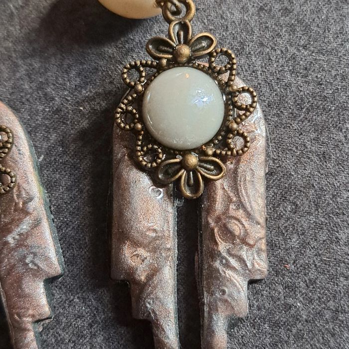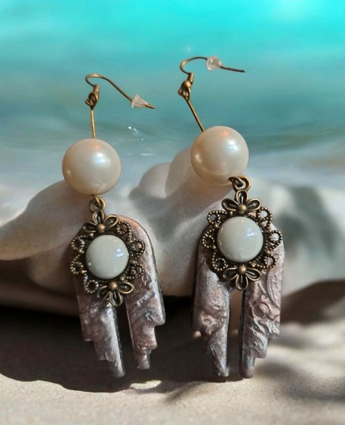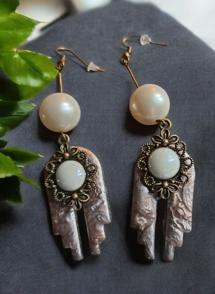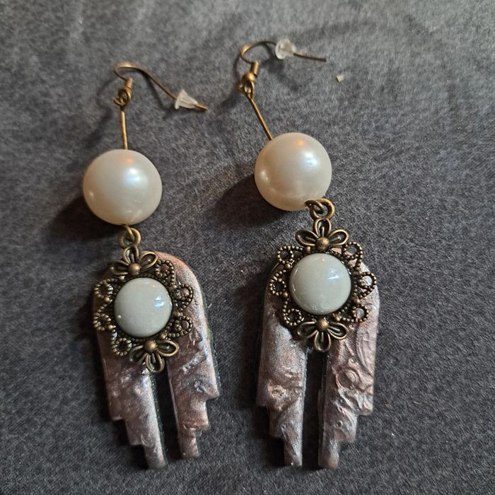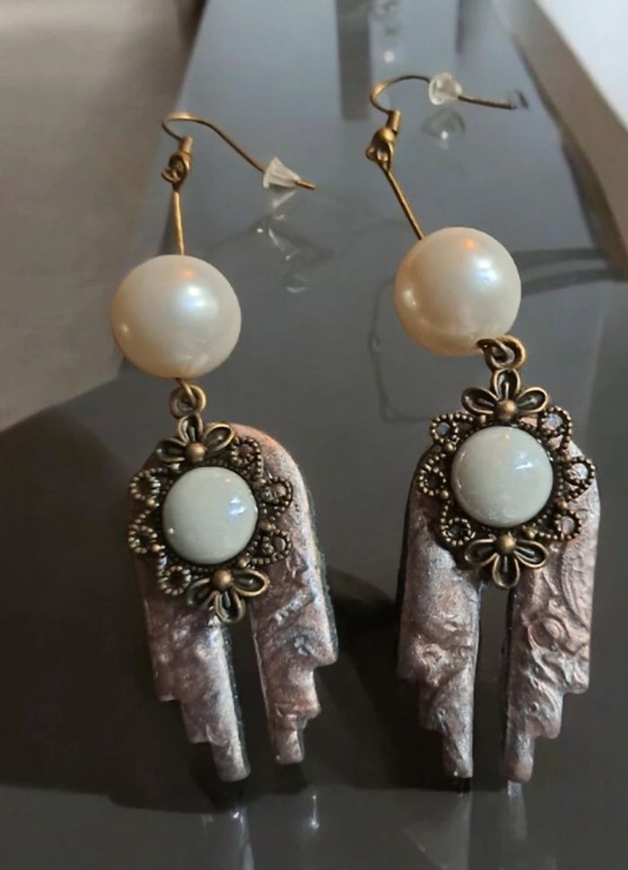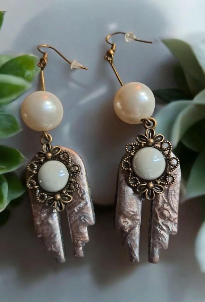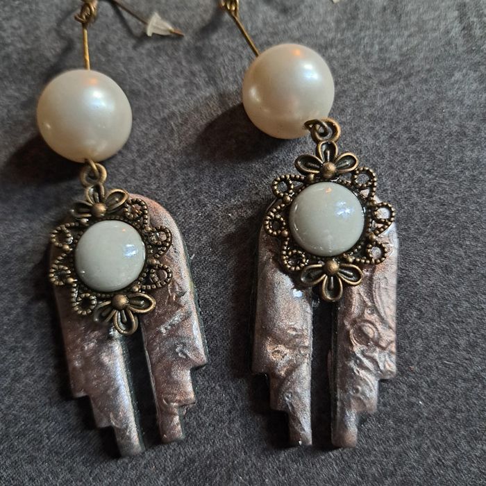 Boucles d'oreilles pendante avec pâte polymere couleur bronze métal avec impression style baroque petit pendentif bronze avec cabochon blanc nacré Unique et original #boucles d'oreilles pendantes # boucles d'oreilles bleu et noir #boucles d'oreilles polymere #boucles d'oreilles fantaisies #boucledoreille # boucles d'oreilles Bohème #boutiqueindependante #bouclesdoreillespendantes #boucles d'oreilles résine #boucles d'oreilles multicolore