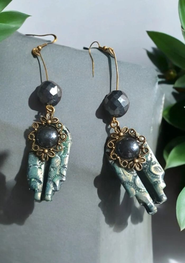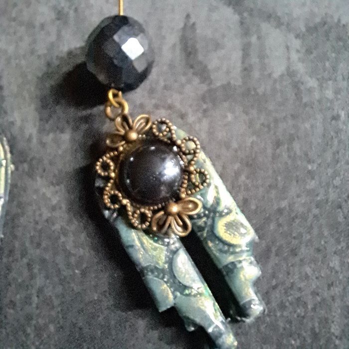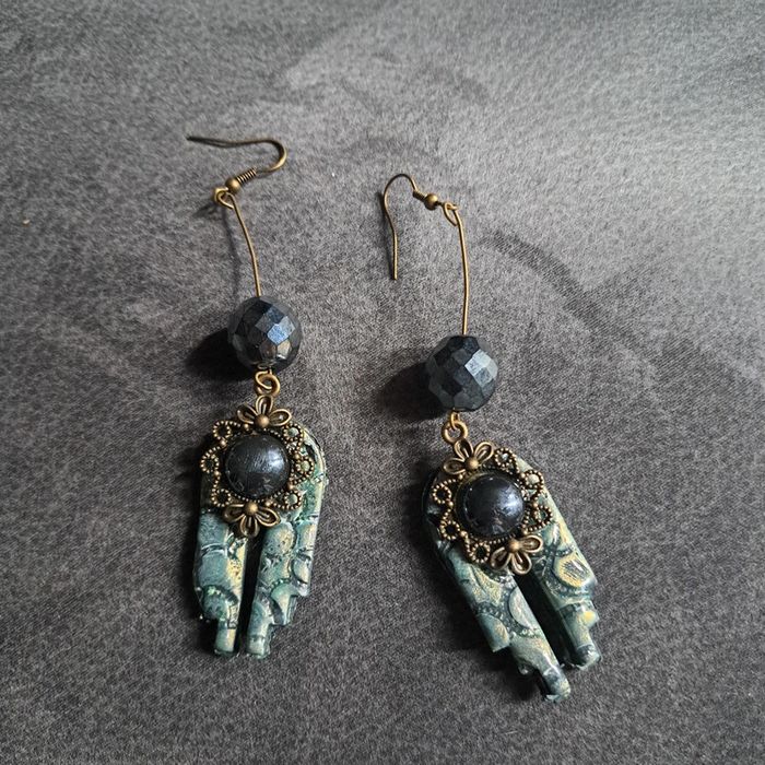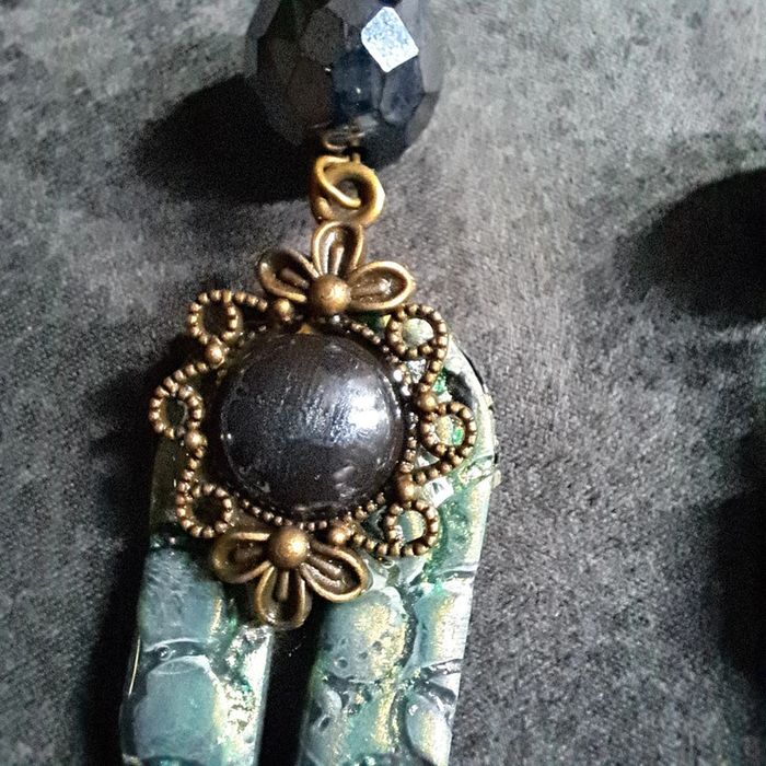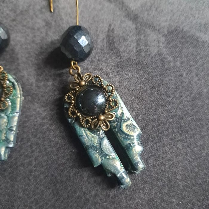 Boucles d'oreilles pendante avec pâte polymere vert métal et noir pendentif bronze avec cabochon noir se qui lui donne un petit côté baroque Unique et jolie #boucles d'oreilles pendantes # boucles d'oreilles bleu et noir #boucles d'oreilles polymere #boucles d'oreilles fantaisies #boucledoreille # boucles d'oreilles Bohème #boutiqueindependante #bouclesdoreillespendantes #boucles d'oreilles résine #boucles d'oreilles multicolore
