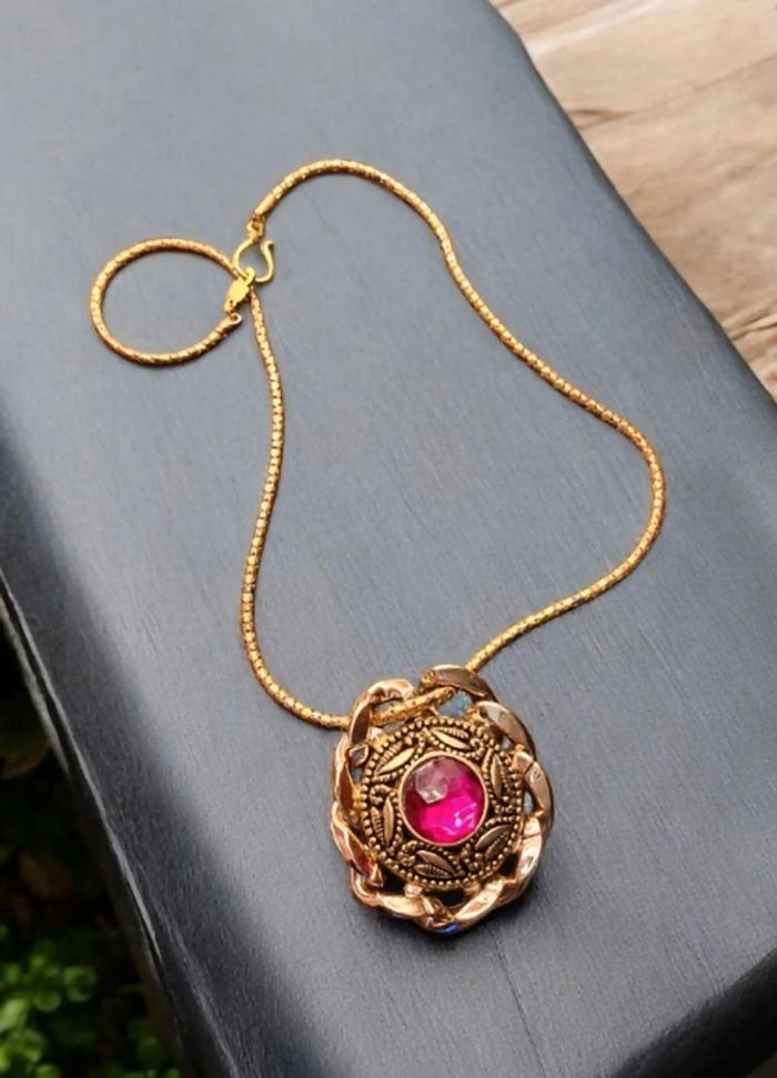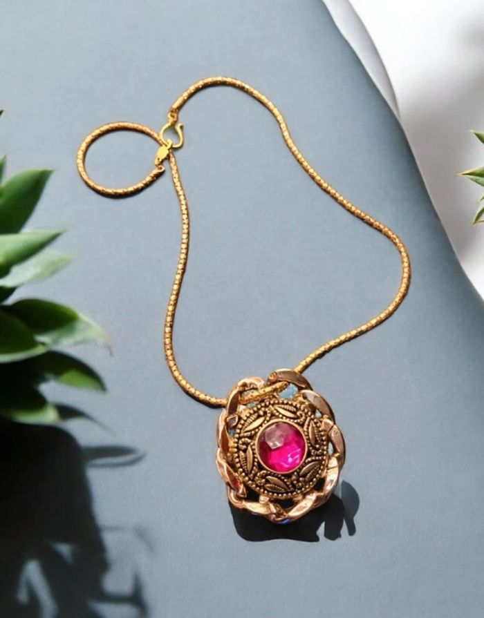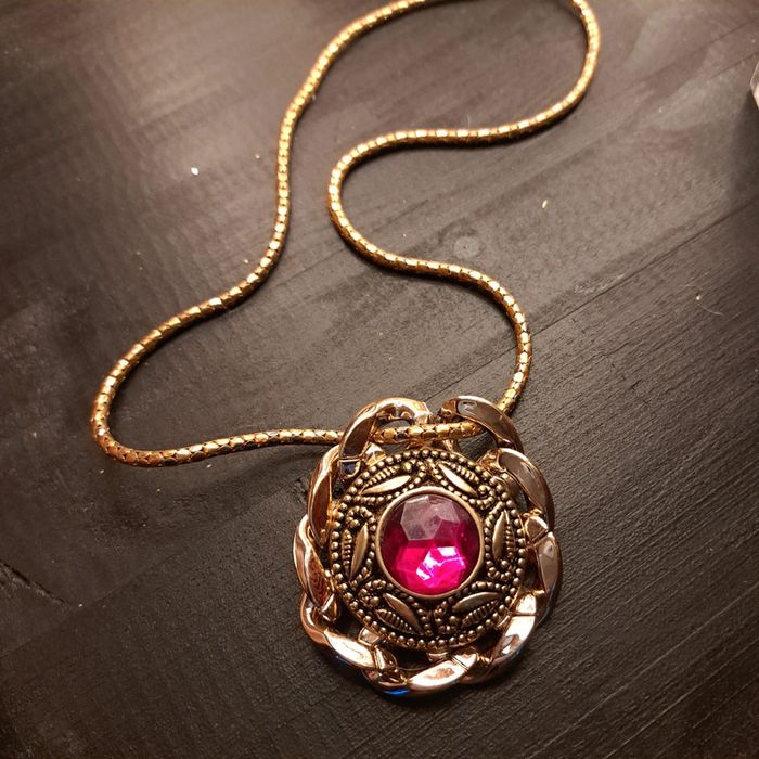 Collier chaîne rouler gros médaillon avec strass rose fushia et chaînette gros maillon autour du strass Belle couleur jolie vintage